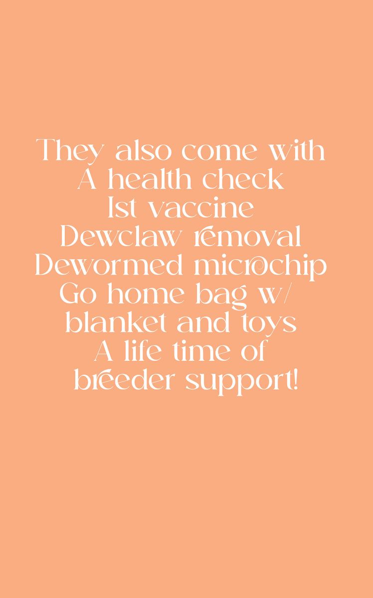 Puppy care education- I help my families prepare to care for their new puppy with step by step instructions on everything from grooming, vet care, product recommendations, to training, so rather you are a new parent or an experienced one, I am available to help you with anything I can, even after your puppy goes home.