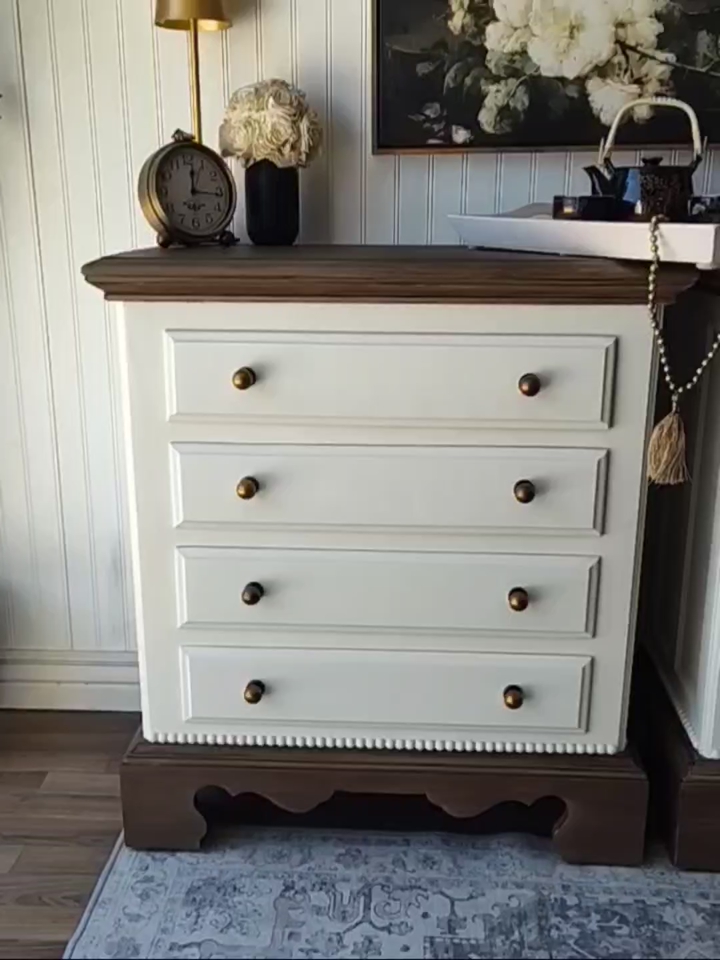 Beautiful extra-large nightstands by Broyhill, professionally refinished in a soft, neutral tone with rich brushed walnut accents on the tops and base. These pieces offer both elevated style and exceptional functionality, with a rare four-drawer design and motion sensor lighting in the top drawers.