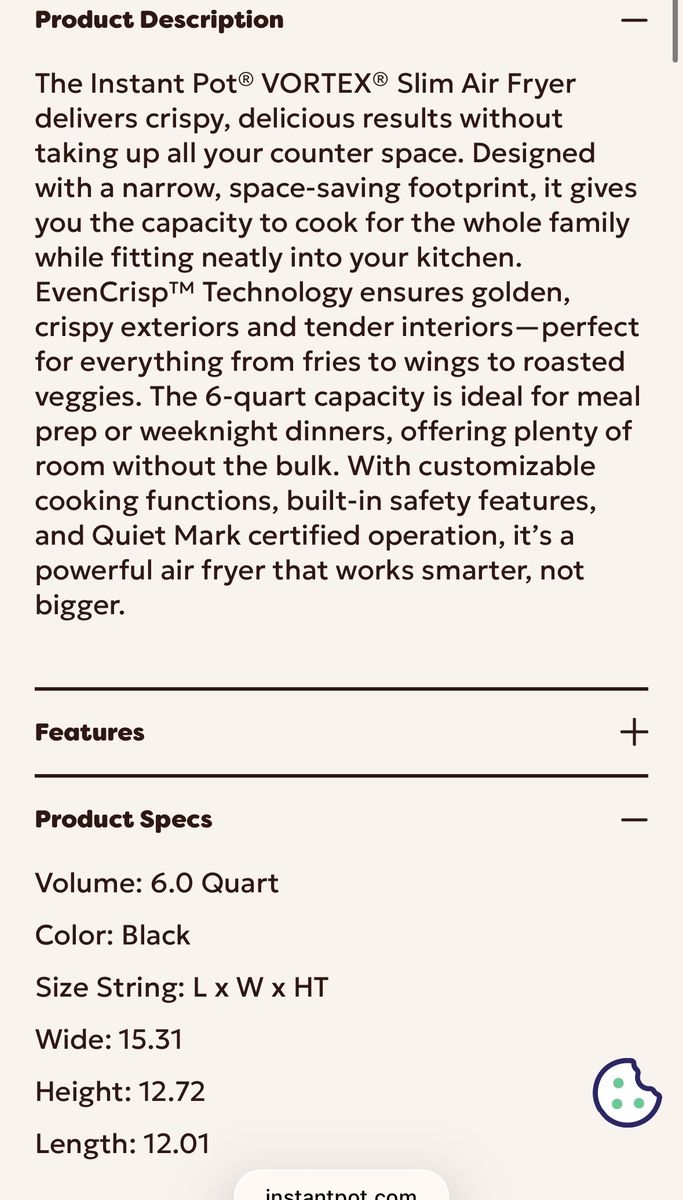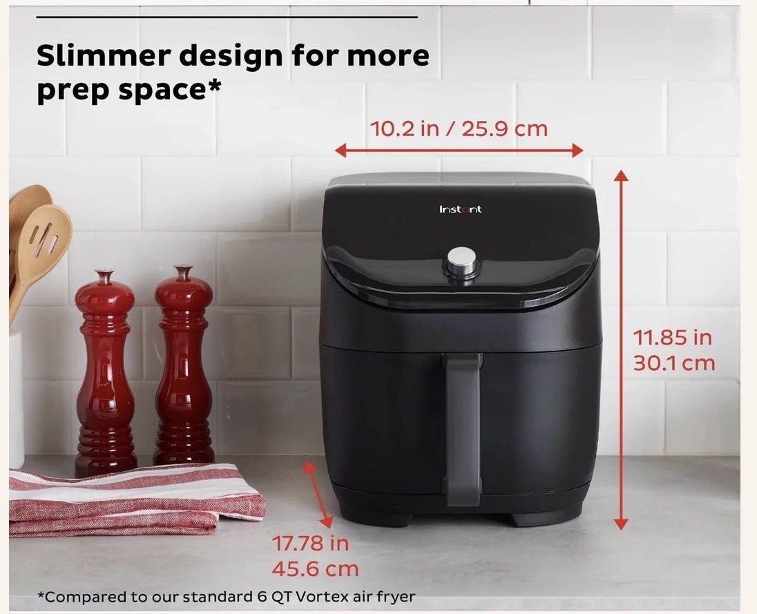 Instant Vortex Slim is perfect for quick and delicious meals-and with a more narrow profile, this appliance will free up prep space. And since this is our quietest air fryer, with Quiet Mark certification, you'll barely hear the air fryer fan. With EvenCrisp technology, you'll get crispy, tender results every time. The size is perfect: big enough for growing families but compact enough to fit any size kitchen. Built-in smart features make it simple to use, with customizable programs for easy cooking and Overheat Protection for safety. Fast, versatile, and convenient, so you can make all your favorite fried foods with way less oil and no mess.