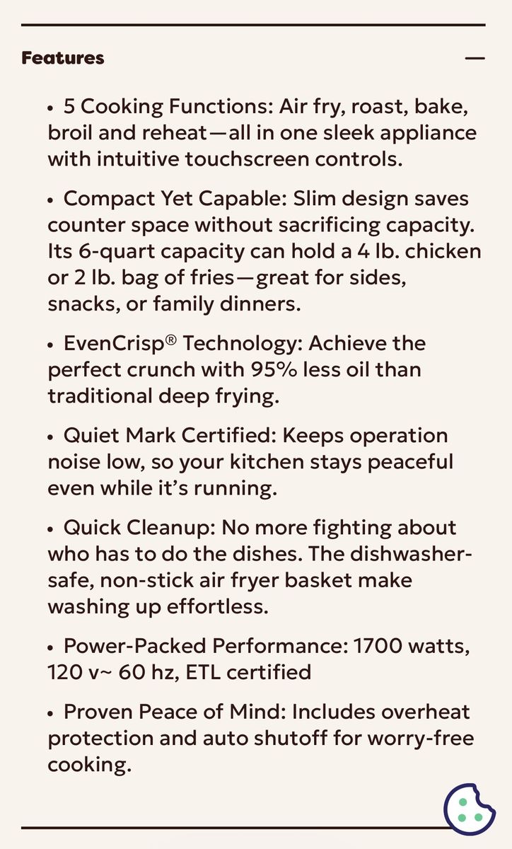 5 in. 1 air fry, roast, bake, boil and reheat 20% slimmer than standard 6 qt. vortex, for more side-to-side counter and prep space Quiet mark certified: our 1 quietest air fryer, for a quieter kitchen compared to our standard 6 qt. vortex Evencrisp technology delivers all the crunch and tenderness of deep-frying with 95% less oil compared to traditional deep frying Adjustable cooking temperature from 120 to 400 °F (49 to 205 °C) Little to no preheating time, cooking from frozen in minutes Easy-to-use touchscreen display shows each stage of cooking Dishwasher-safe, non-stick air fryer basket and cooking tray are easy to clean Holds a 4 lbs. chicken or 2 lbs. bag of fries, enough for growing families, side dishes, and meal prep Built-in safety includes overheat protection and auto-off 1700-Watt, 120-Volt- 60 Hz. ETL certified