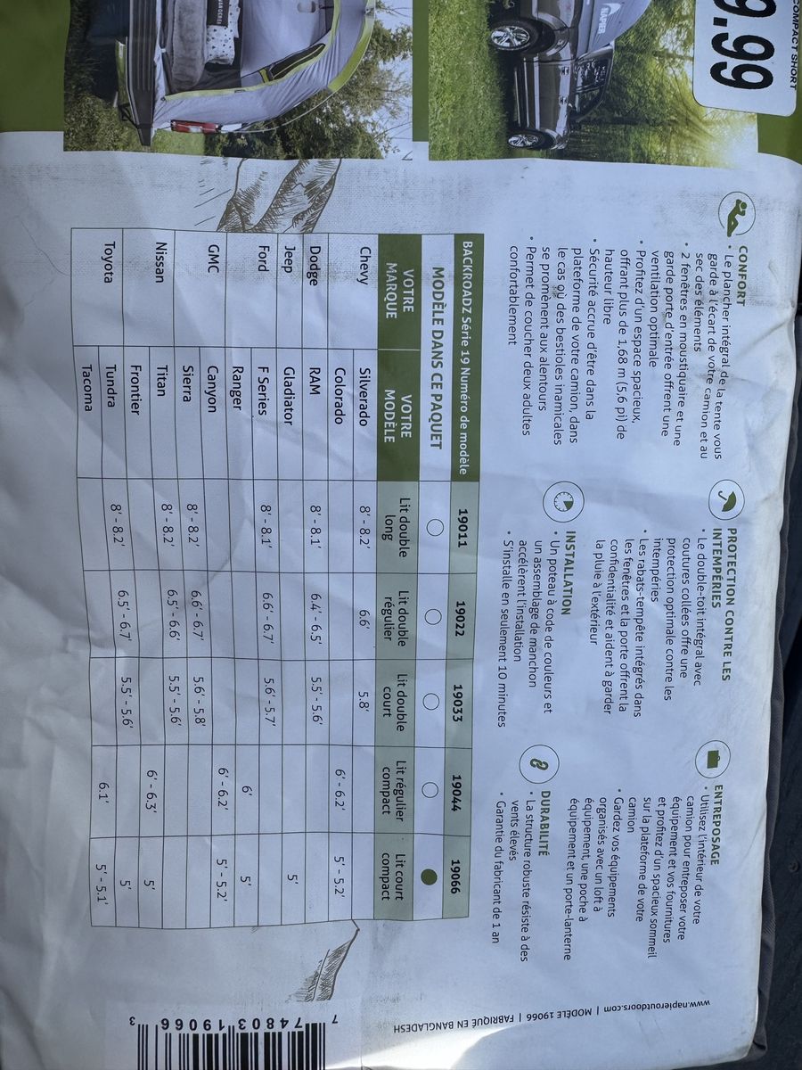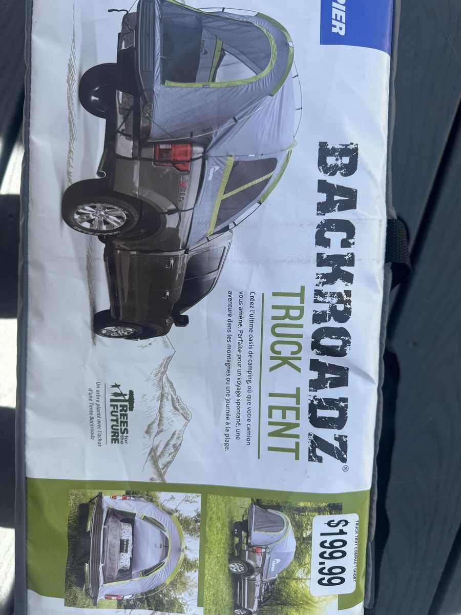 ZelleI am selling a brand new, never opened Napier Backroadz Truck Tent. Still sealed in its original box, it has never been used. This is a great, economical way to turn your truck into a mobile camper. Key Details: • Condition: New In Box (NIB), Factory Sealed. • Model: BACKROADZ Series. (See photo for fitment details) • Fits: According to the manufacturer chart on the box, this specific model (based on the price tag code of "FULL-SIZE TRUCKS") is designed to fit standard and long bed full-size pickups (e.g., Ford F-150, Chevy Silverado, GMC Sierra, Ram, Toyota Tundra, etc. with standard/long beds). Please refer to the fitment chart in the photos to confirm your exact truck bed size (e.g., 5.5', 6.5', 8'). • Includes: All necessary tent materials, instructions, and rainfly. Features: • Sleeps 2 people comfortably. • Easy, quick setup. • Internal pocket for storage. • Large windows and door for ventilation. • Integrated floor to keep you and your gear dry and off the ground.