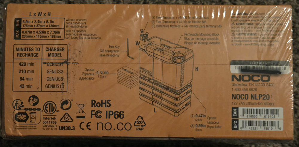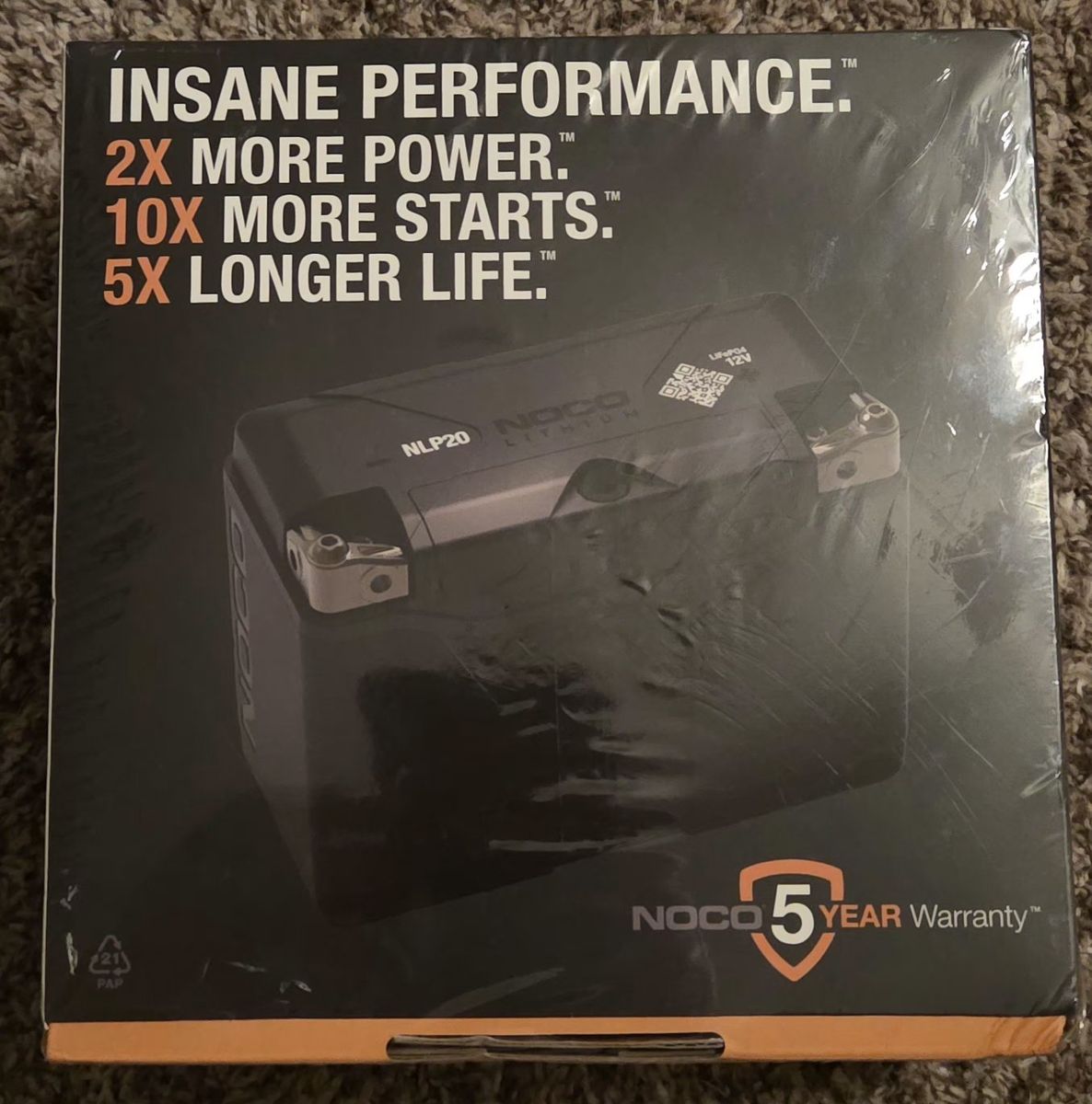 NOCO Lithium NLP20 12V Lithium Powersport Battery, a Group 20 battery, rated at 7Ah (89Wh) and 600-amps of starting power. It's better than lead-acid motorcycle batteries in almost every way: no sulfation, no activation, no acid, no maintenance, no water needed, and it comes fully charged and ready to install.