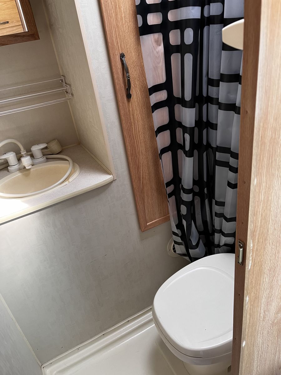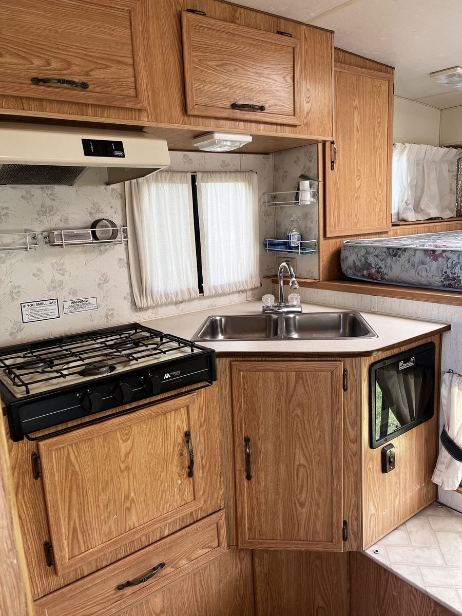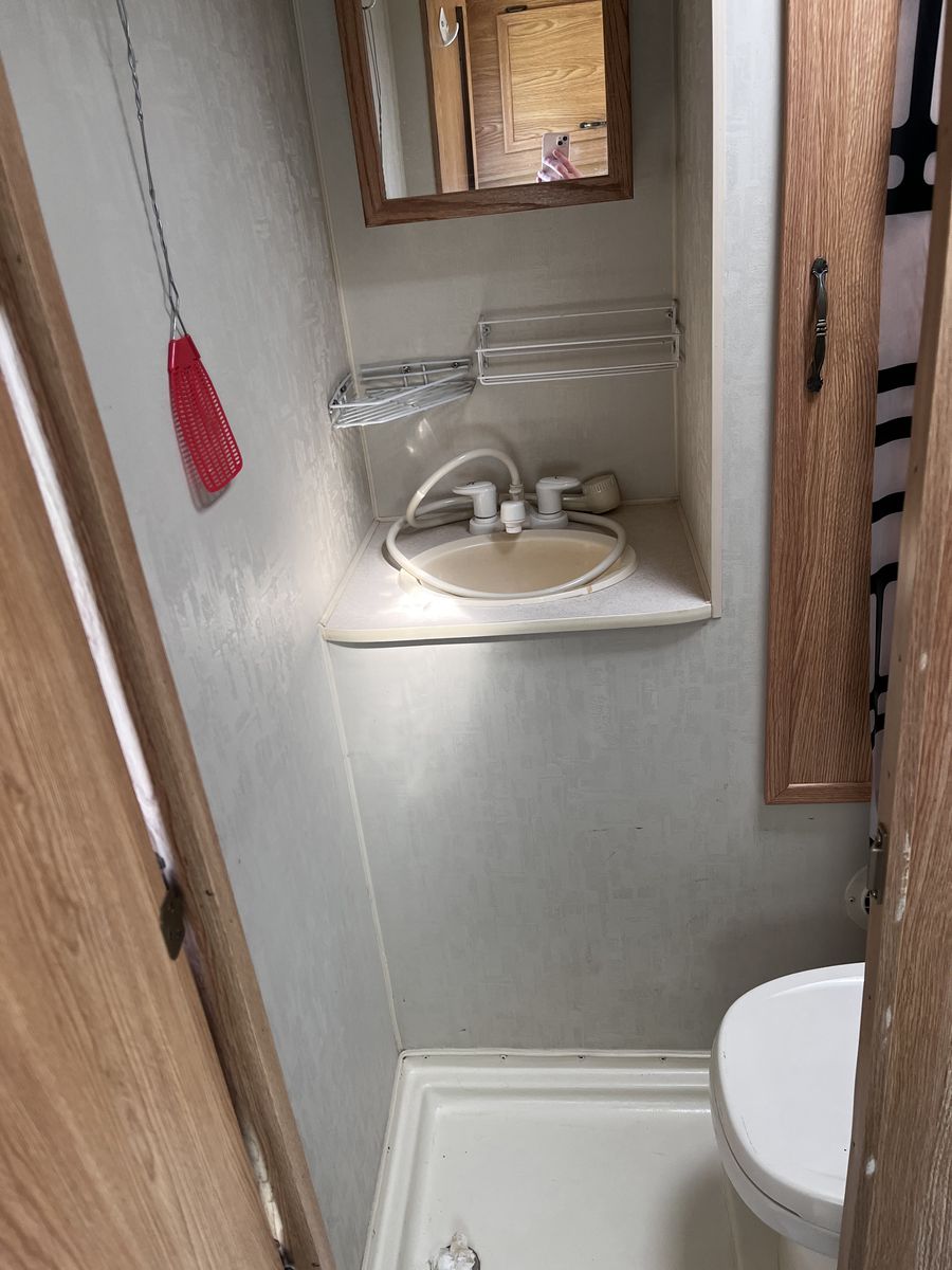 In good condition interior and out. I replaced the water pump. The floor is fully insulated so it is great for extended seasons well into fall weather. Sink and stove work great, as does the bathroom and shower. Has external shower set up as well.