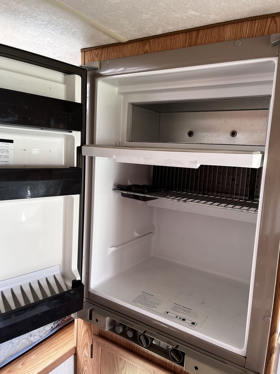 Hookups and all electric work perfect. Fits a queen mattress and the table folds down into a second bed. Fridge and freezer are in perfect shape and work on both gas or electric.