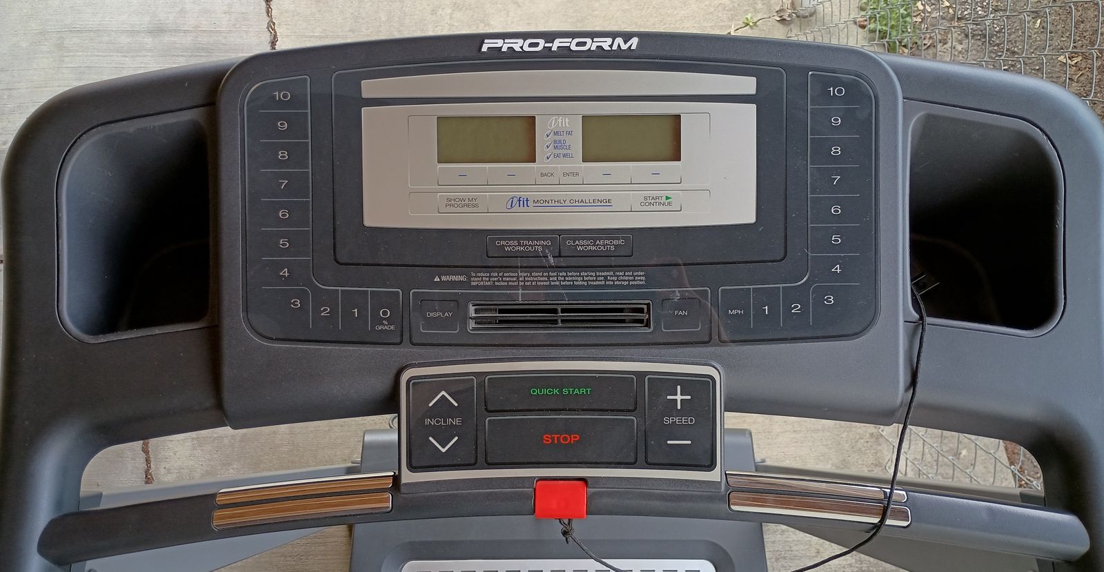 Inclines up to 10 with speed up to 10. Has a working safety shut off clip. Folds up when not in use to conserve space.