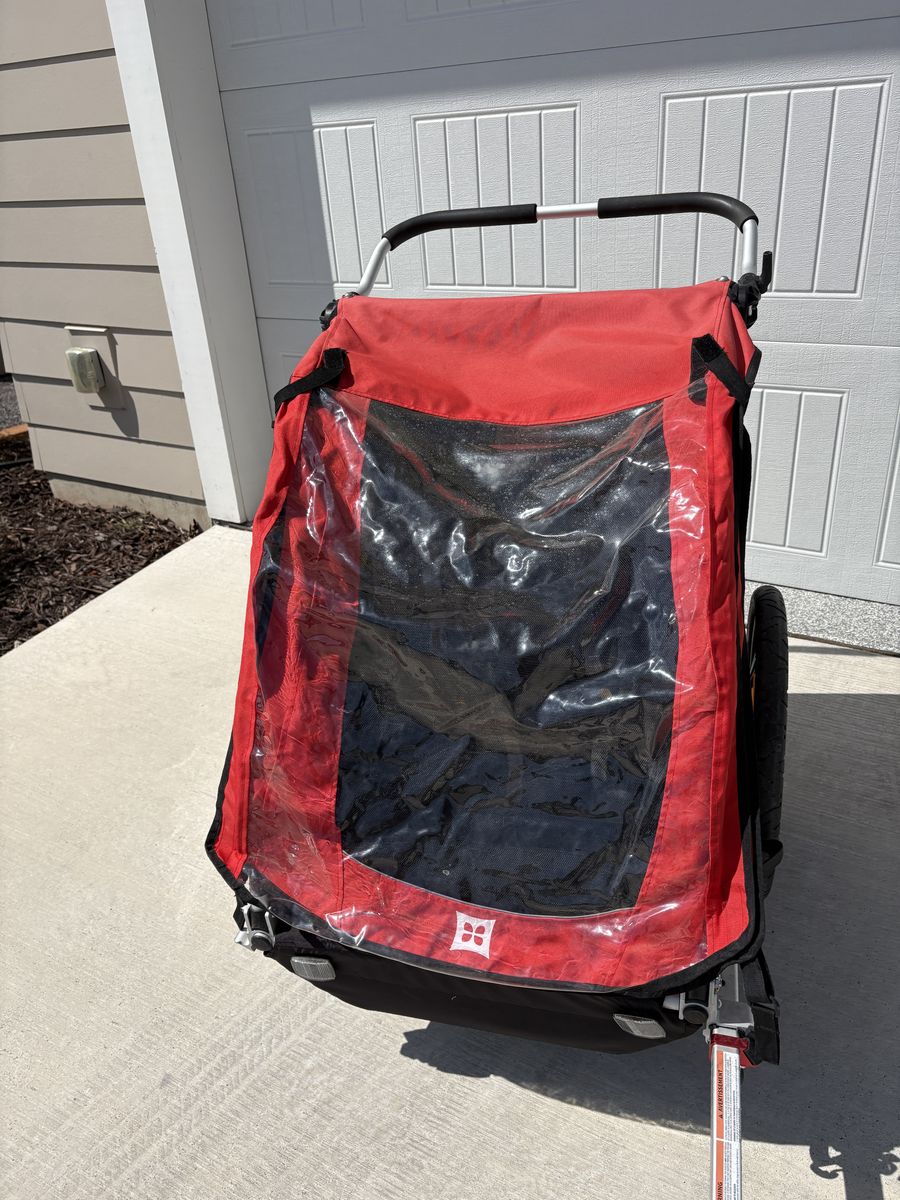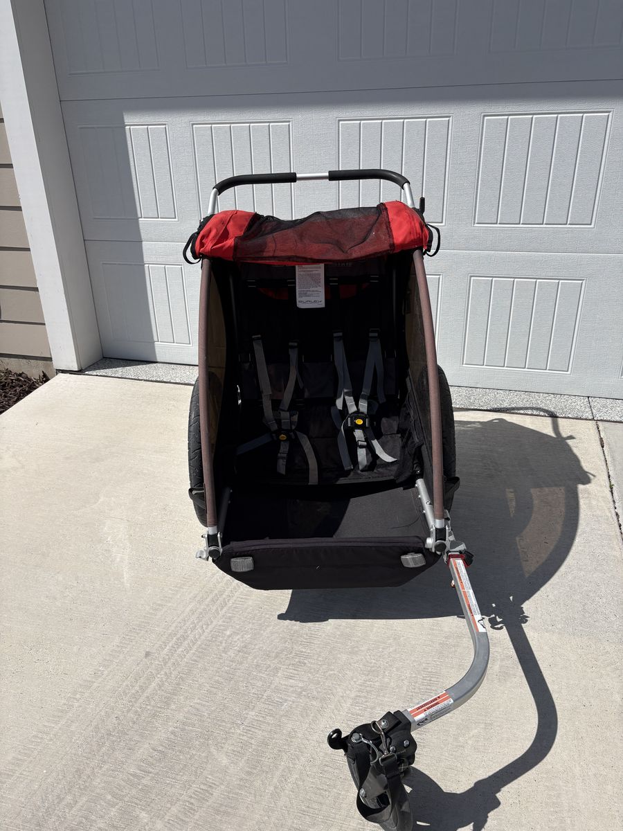 VenmoBurley Honey Bee, 2 Seat Kids Bike Trailer & Stroller. This can hook on the back on a bike or be used as a stroller for walking or running. Has 2 seat belts for children. Folds up for easy storage or transportation. Sun faded from lots of use but great condition otherwise.