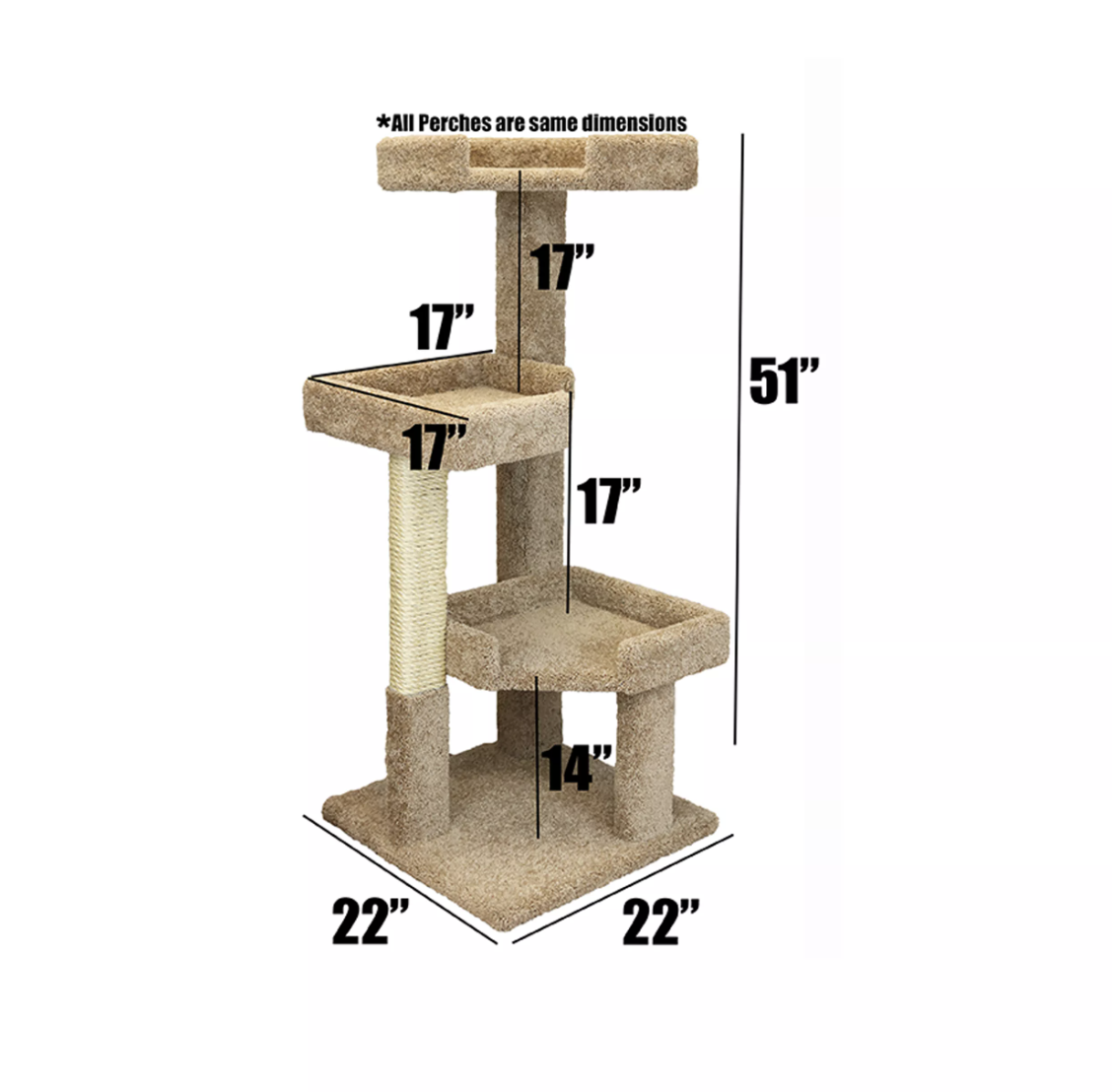 Features: Carpeted posts for scratching, thick natural sisal rope posts for scratching, multiple large and spacious perches for laying and sleeping