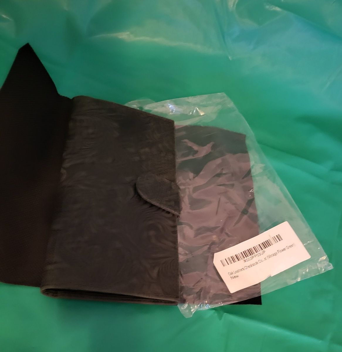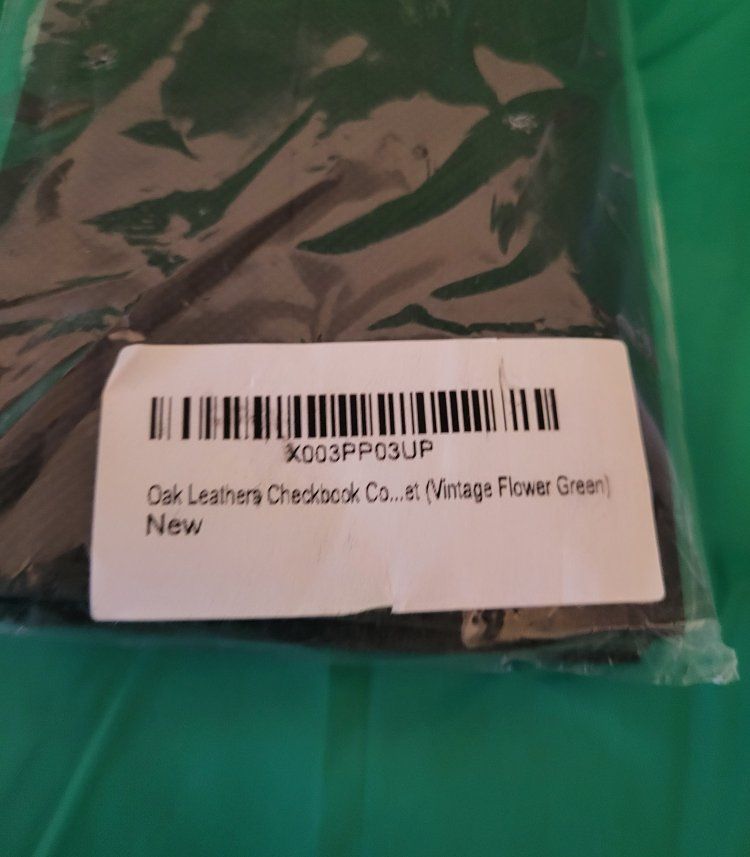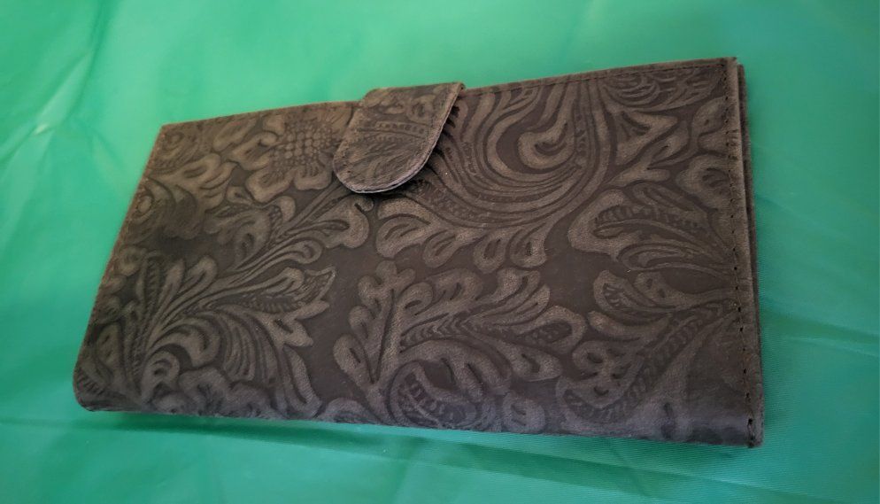 Brand unknown ~ genuine leather with embossed oak flower design ~ several pockets ~ checkbook flap ~ space for credit cards & ID ~ new in package, never used.