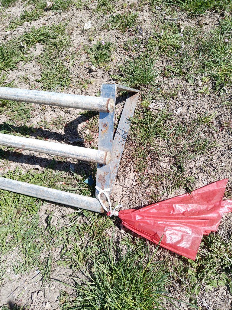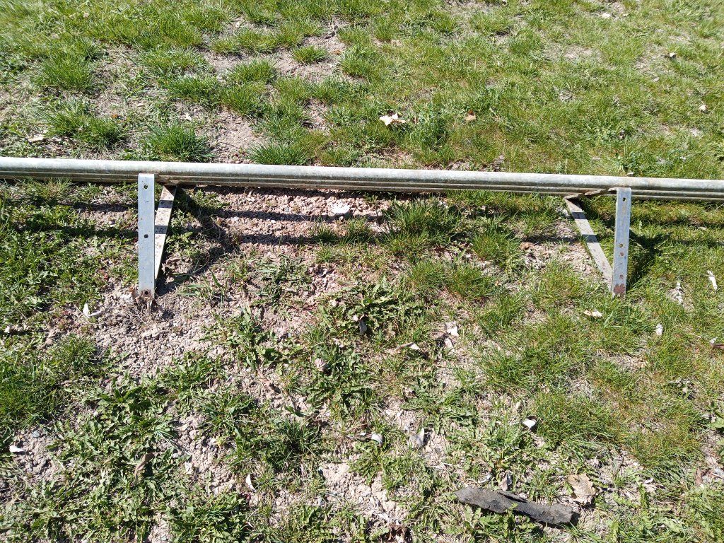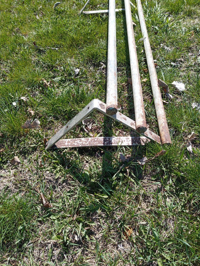 Metal garage storage shelf with 3 rungs and triangle brackets measures 16 feet by 1 foot.