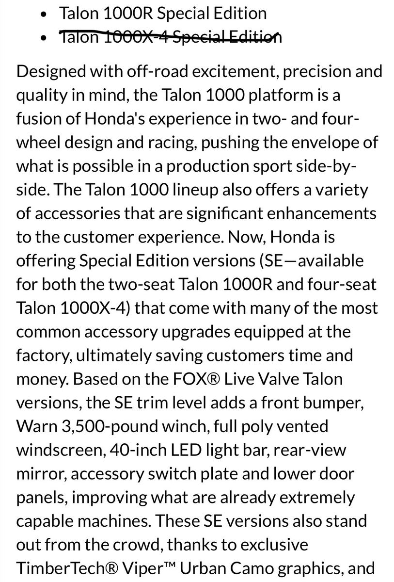 Venmo2021 Honda Talon 1000R Talon special edition black camo. 106 miles since new, have a waterproof stereo still in box new. It is equipped with winch and windshield and roof. You can look it up. I just don’t have time for it right now.
