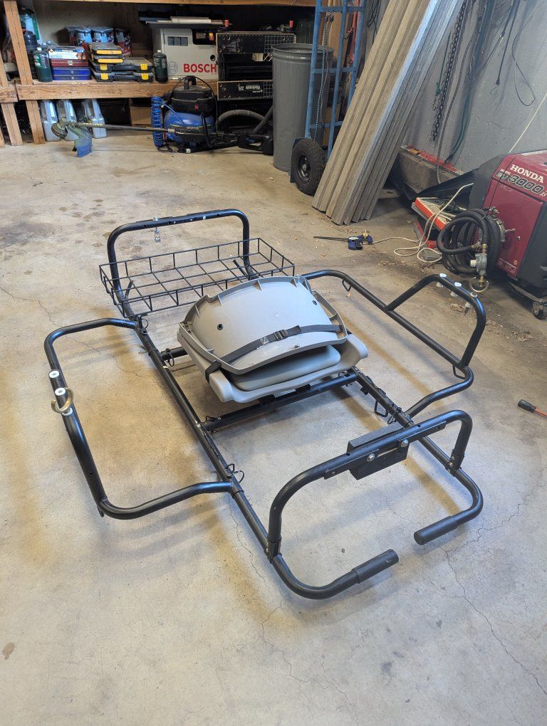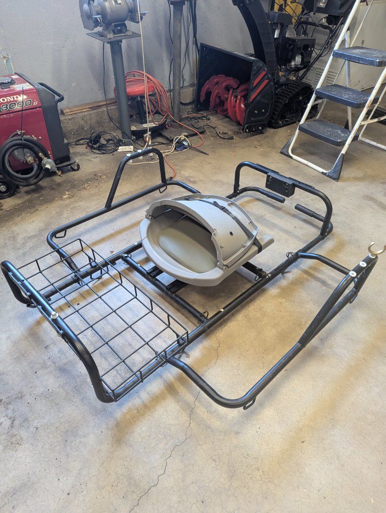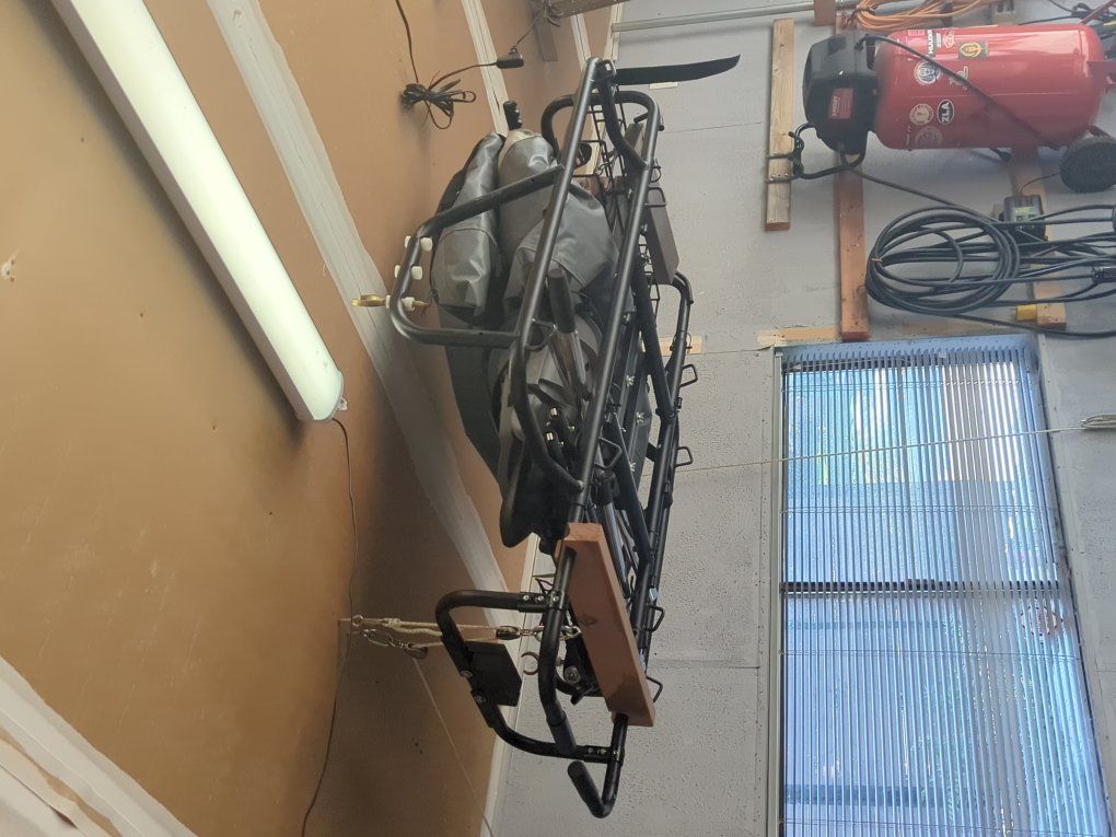 Primary photo is a stock photo; this is the same boat but the pontoons are burnt orange color. The other photos are of the actual boat. I added some frame work to allow mounting the trolling motor in the front. This makes controlling the boat way more convenient, stable, and easy. No punctures or patches. Comes with a Minnkota C2 30 pound thrust trolling motor, deep cycle battery and battery box, 12 volt high pressure inflator, manual air pump, and lead anchor. This has been a great little fishing setup and as you can see from the photo, can be stored on the ceiling compactly.