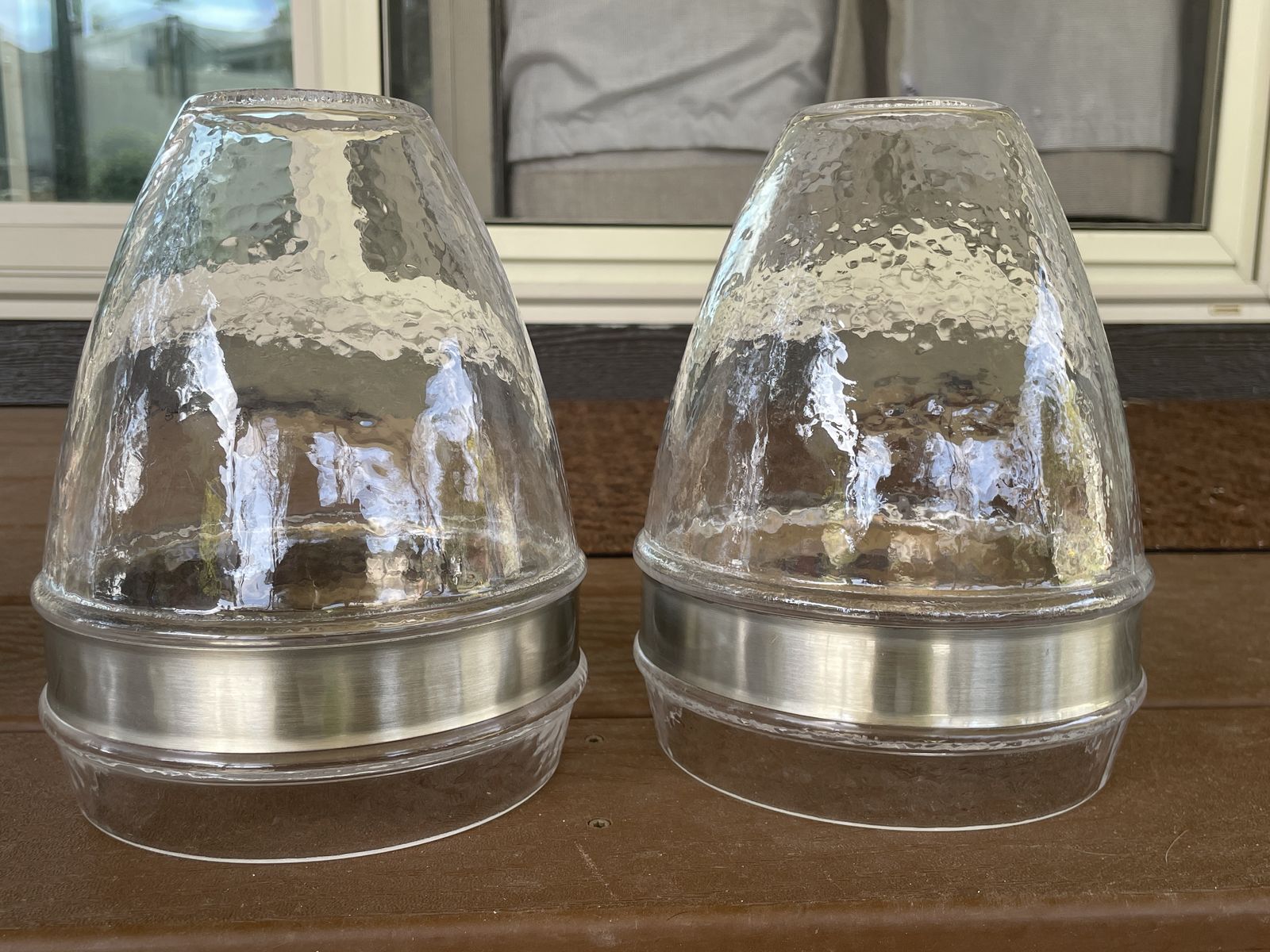 Pendant fixture shades. Hammered glass with brushed nickel trim. Six, all same size. Seven (7”) inches tall by six (6”) wide. Excellent condition, no dirt, chips or cracks. Available new in Lowe’s at $25 each. $60 for all six. Sandy. Cash only.