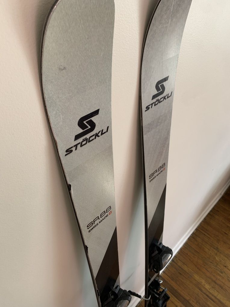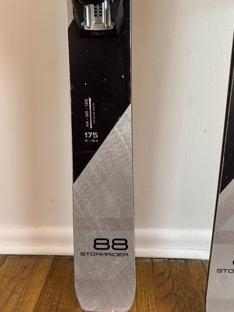 Stockli stormrider 88 175cm titanium top sheet, very responsive skis Tyrolia adjustable bindings set up for a size 41 boot binding can size up to a 10 Used but in good condition, base is clean, top sheet has some scratches