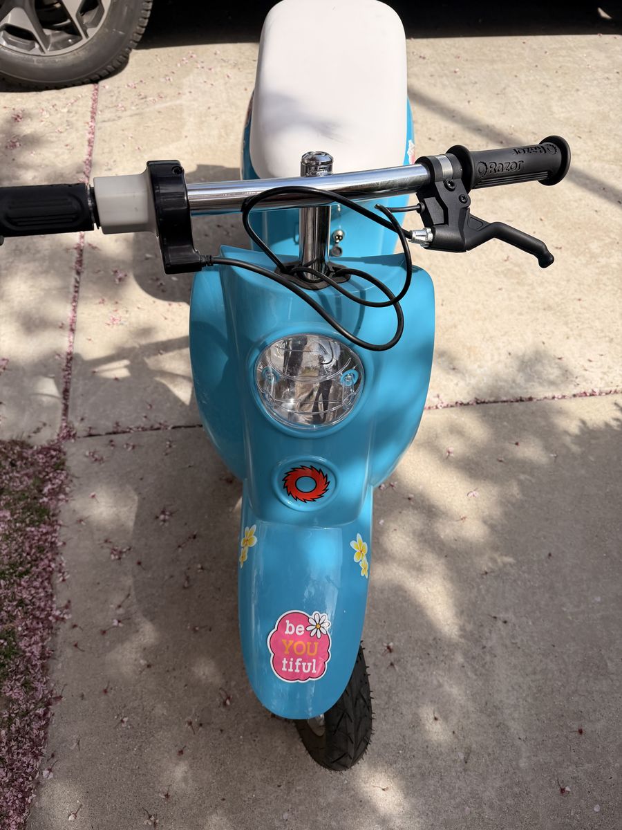 VenmoRazor Chrissy electric scooter. It’s in very good shape. Super cute vintage style, in turquoise. I wired a little bigger battery so it’s got a bit more power than the average razor scooter. Lots of fun!