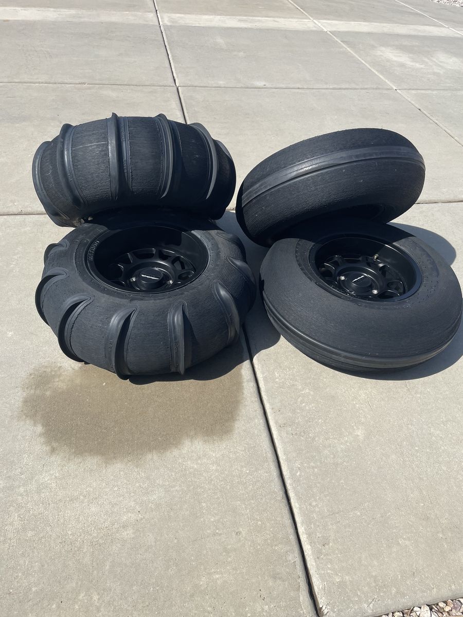 Skat trak talon 12 paddle tires and method bead grip rims. Came off of a can am x3. One front tire has a patch from a few years ago doesn’t leak. Rims have a few scratches as pictured. 1200 OBO