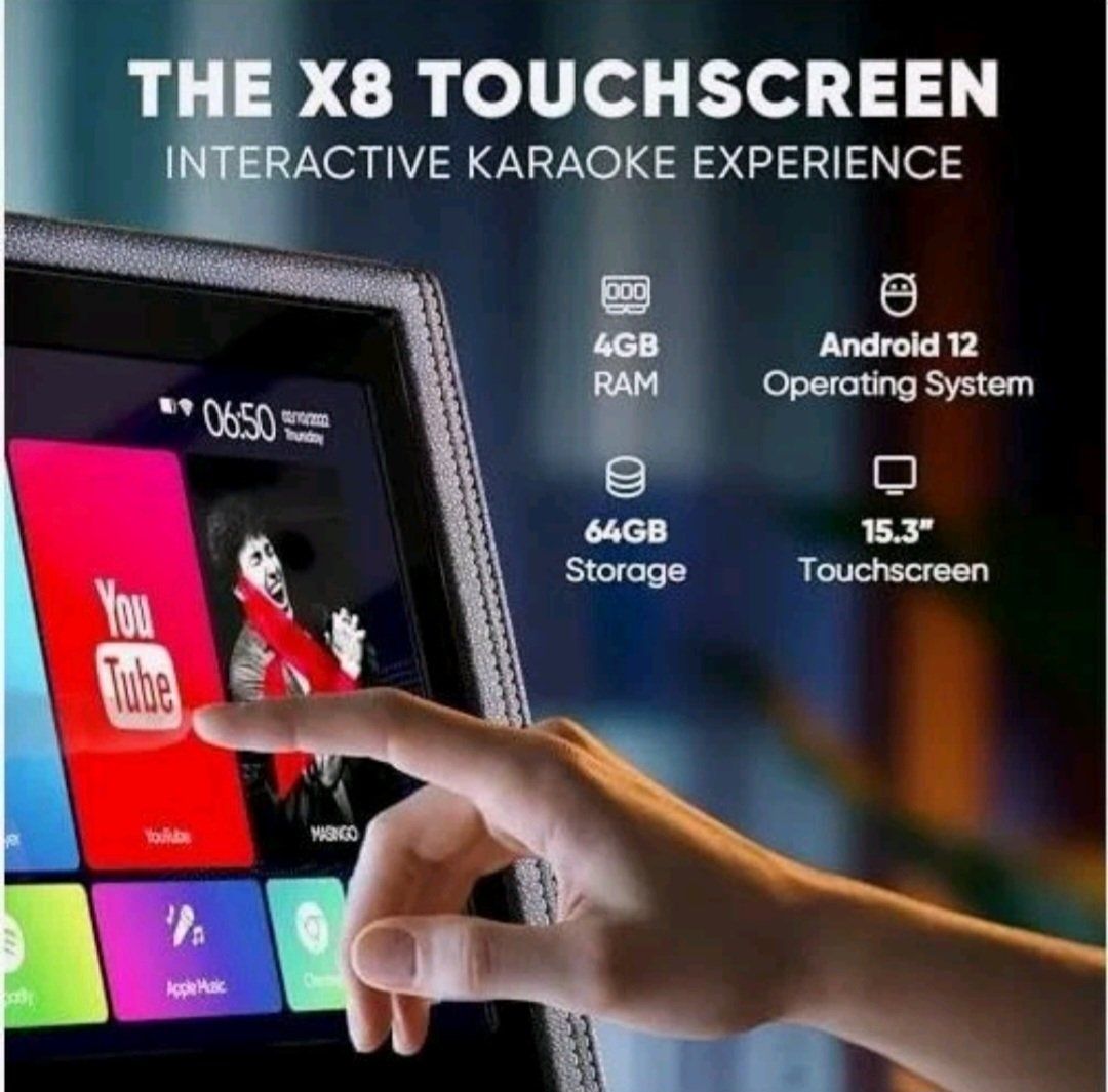Why this is the best karaoke machine on the market: Built-in 15” Touchscreen: No need to connect a phone or laptop. It runs on Android with pre-installed apps like YouTube so you can find any song instantly.
