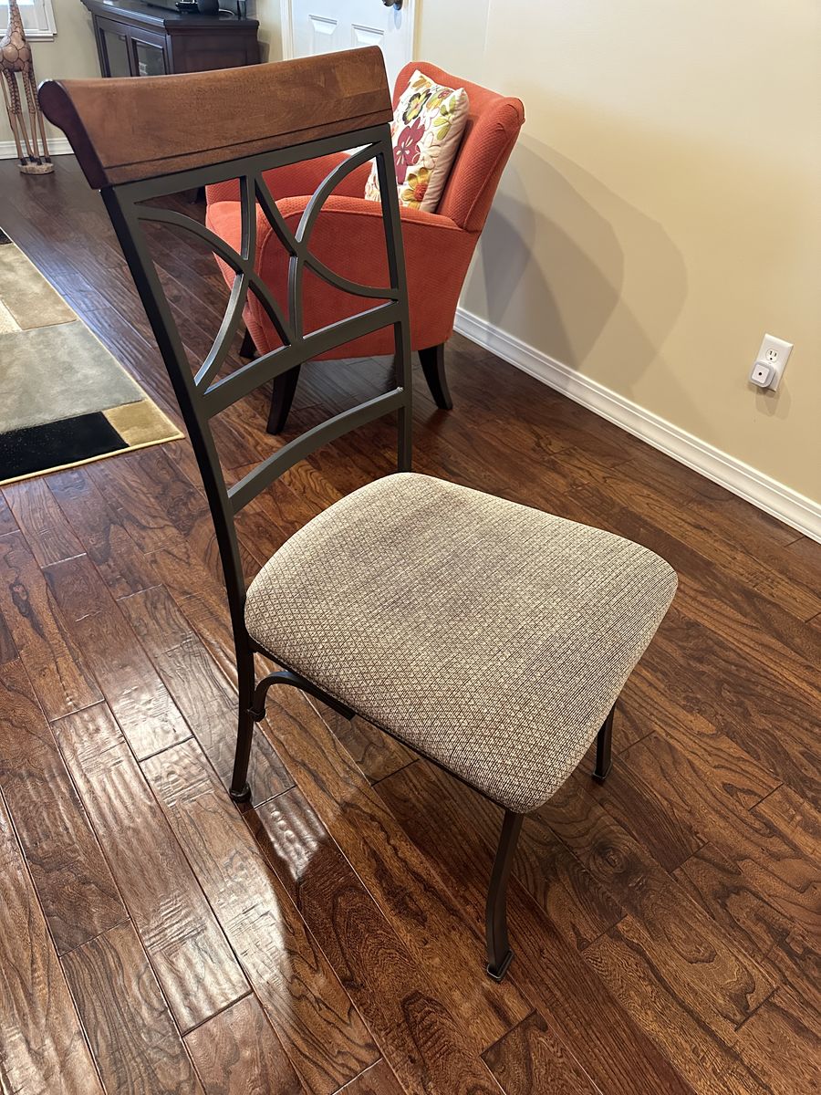 PRICE REDUCED... I'm selling a 4 piece set of dining room chairs, and 2 matching counter-height barstools. These chairs are constructed with metal legs and frames, with a wood accent on the back, they have a padded fabric covered seat. These chairs are in excellent condition with very little if any signs of wear. The barstools are good for a counter height of approximately 32 to 38 inches high (seat height is 24"). I’m only asking $80., for the entire set. If you only want the dining chairs it will be $60.(all 4), the barstools sold separately would be $30. (for the pair) Note: this funiture is in a non-smoking, no-pet home. Should you have any question, please call or text Kent at: 801-558-2459. (the table is not for sale)