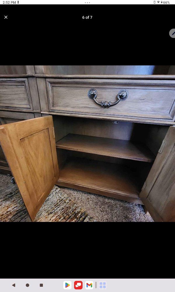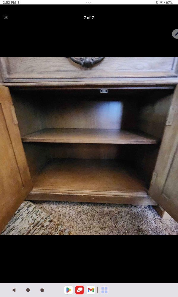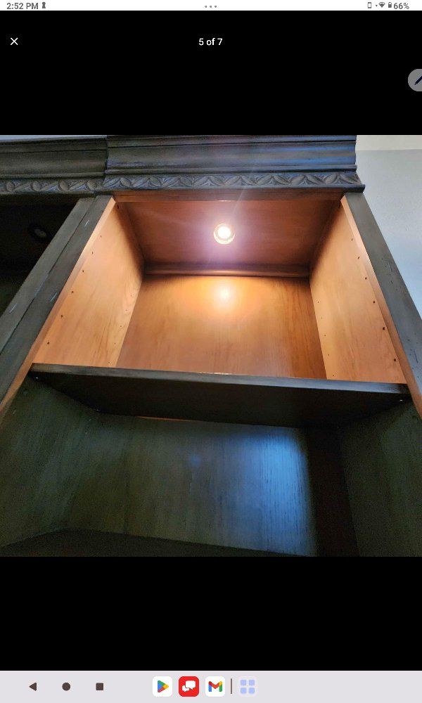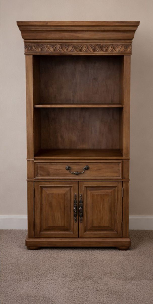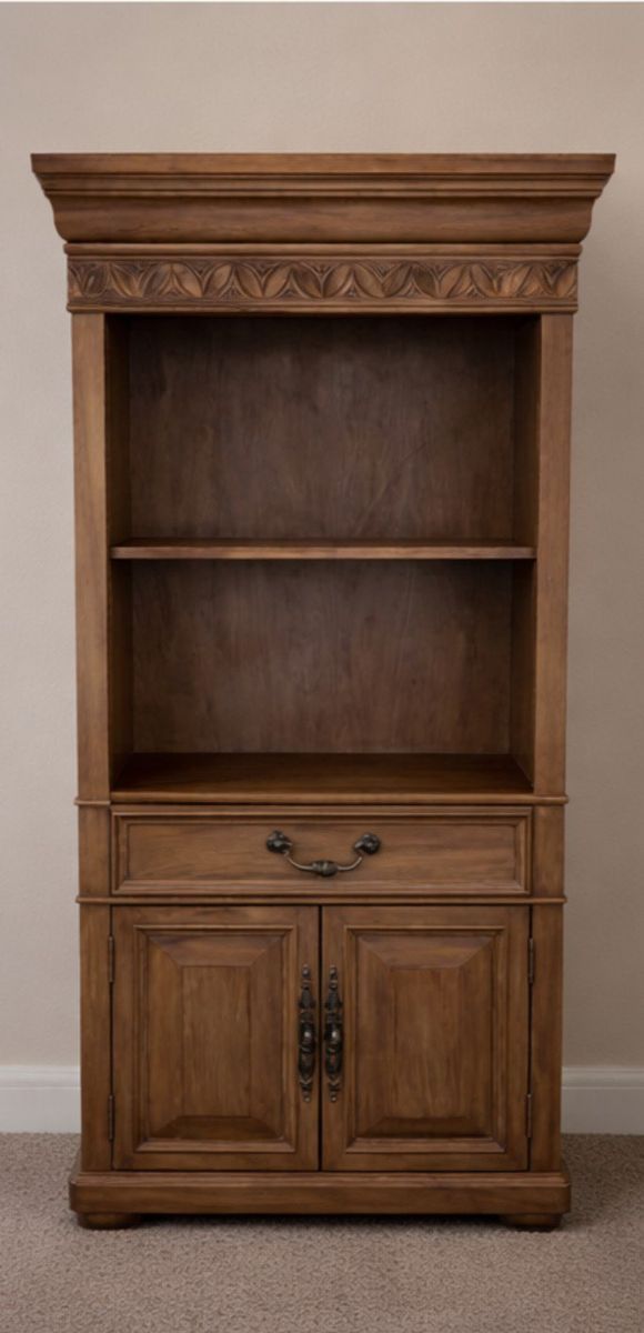 Armoire/center unit is 4' W x 7' H x 26" D and comes apart in 2 pieces for moving. The shelves are 30" W x 74.5" H x 15" D. I hate to part with this, but I am moving cross-country and don't want to haul it around. Brand new was over $3500. Selling for $850