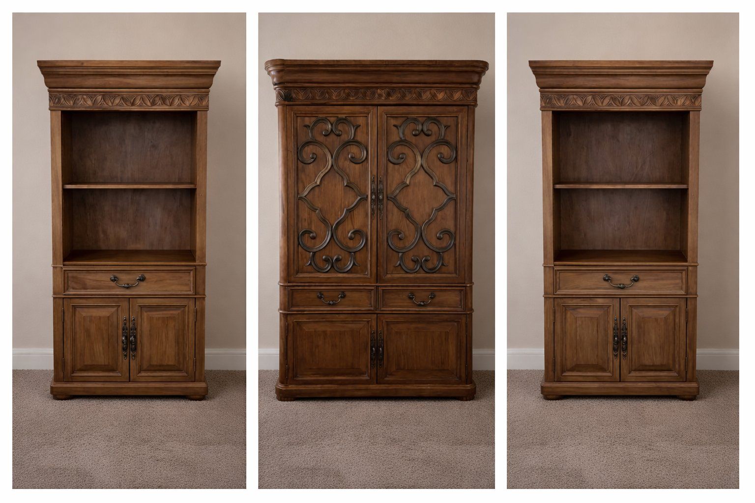 ZelleBeautiful, well-made armoire with 2 lighted shelf units that can go on both sides for one beautiful entertainment center, or use all separately. I have done that for the last 5 years. It's a big, beautiful piece altogether, or separate. Either way, they're all sturdy, and well-made furniture