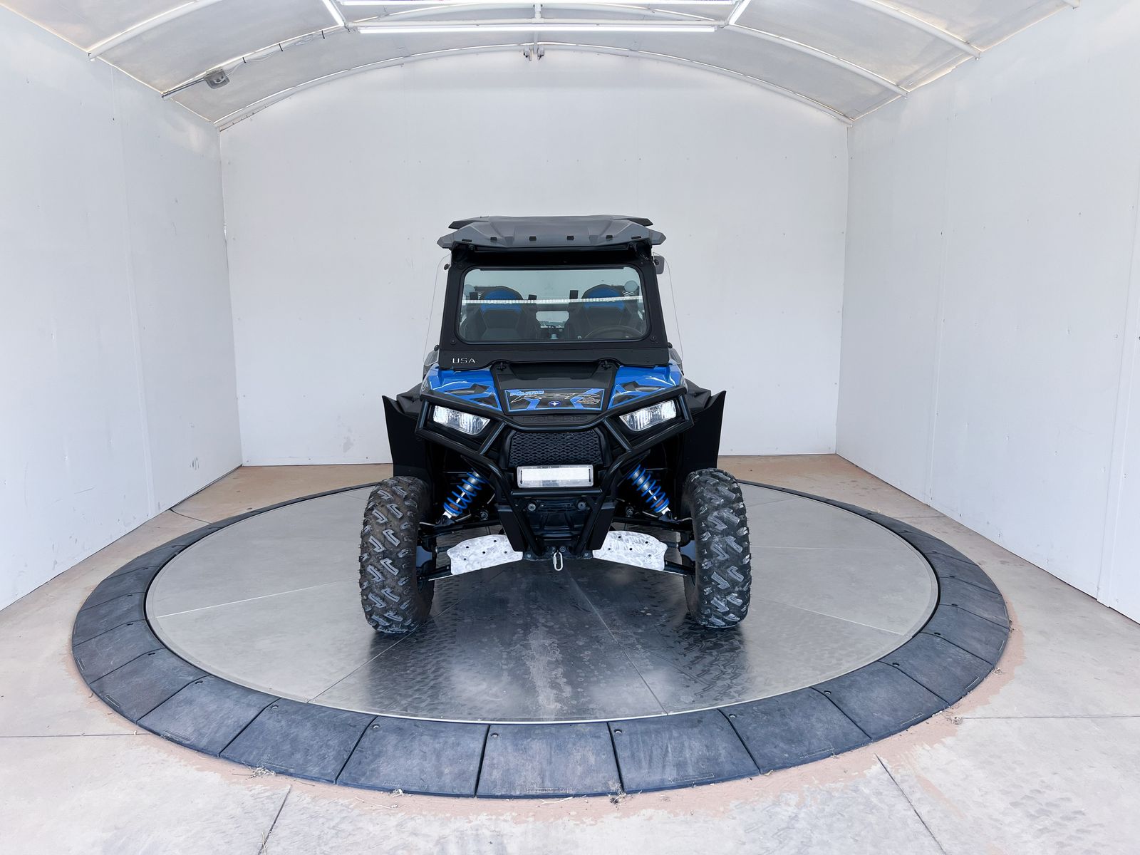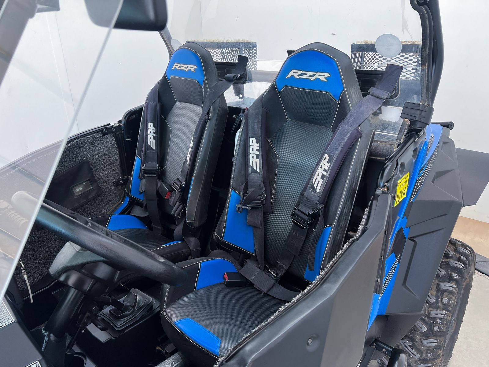 This machine comes equipped with a front bumper with a light bar, front windshield, roof, extended fender flares, rear panel, rock sliders, rear bumper with a spare tire holder and a spare tire, A-Arm guards, rear mirrors, full aluminum doors, and PRP harnesses.