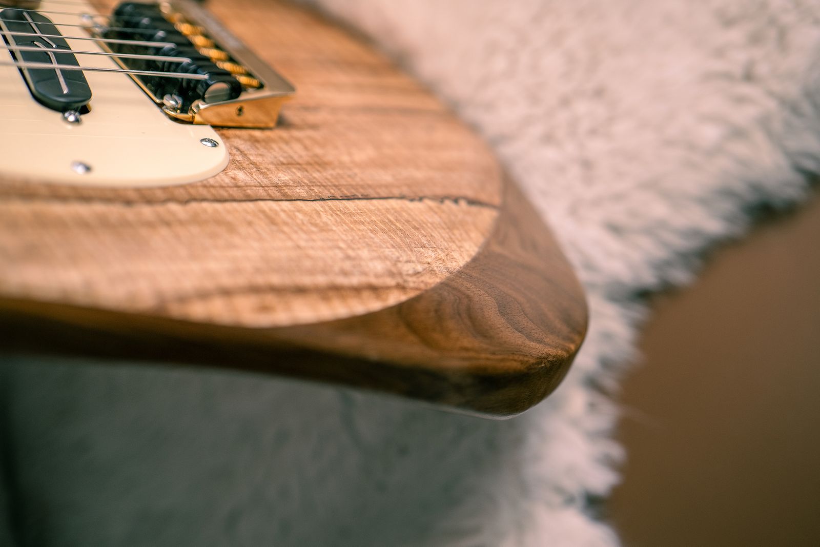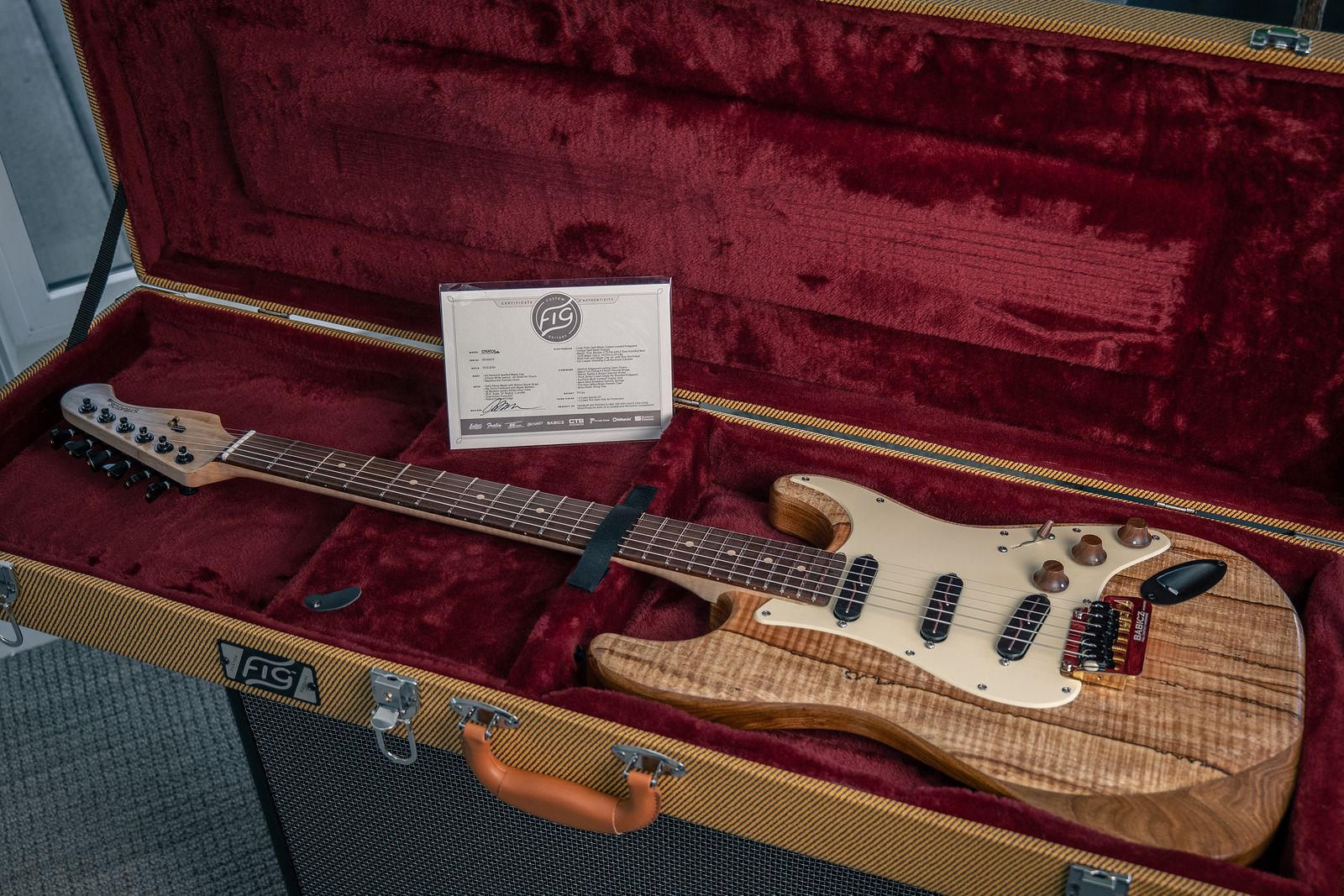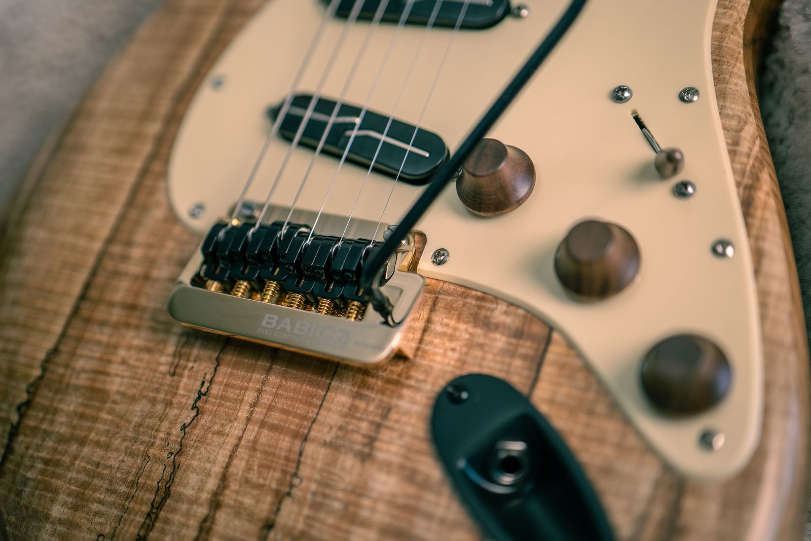 HARDWARE • HipShot Staggered Locking Open Tuners • Babicz Full Contact 2-Point Tremolo Bridge • Walnut Tophat & Bronze Selector Knobs • Thick (2mm) Cream Single Ply Shielded Pickguard • PureTone Multi-Contact Output Jack • Black Steel Noiseless Tremolo Springs • Precision-Milled Brass Tremolo Claw • Brass Roller String Tree