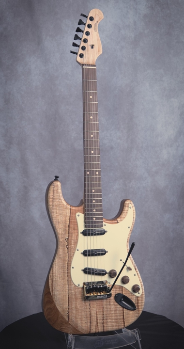 BODY • 5A Flamed & Spalted Maple Cap • 2 Piece White walnut - Air Dried for 10+yrs • Matched Ash Tremolo Cover NECK • Satin Flame Maple with Walnut Skunk Stripe • Pau Ferro Fretboard with Maple Markers • 22 Medium Jumbo Nickel Silver Frets • 25.5” Scale, 10” Radius, C profile • Dual Action Truss Rod • Rolled Fretboard Edge