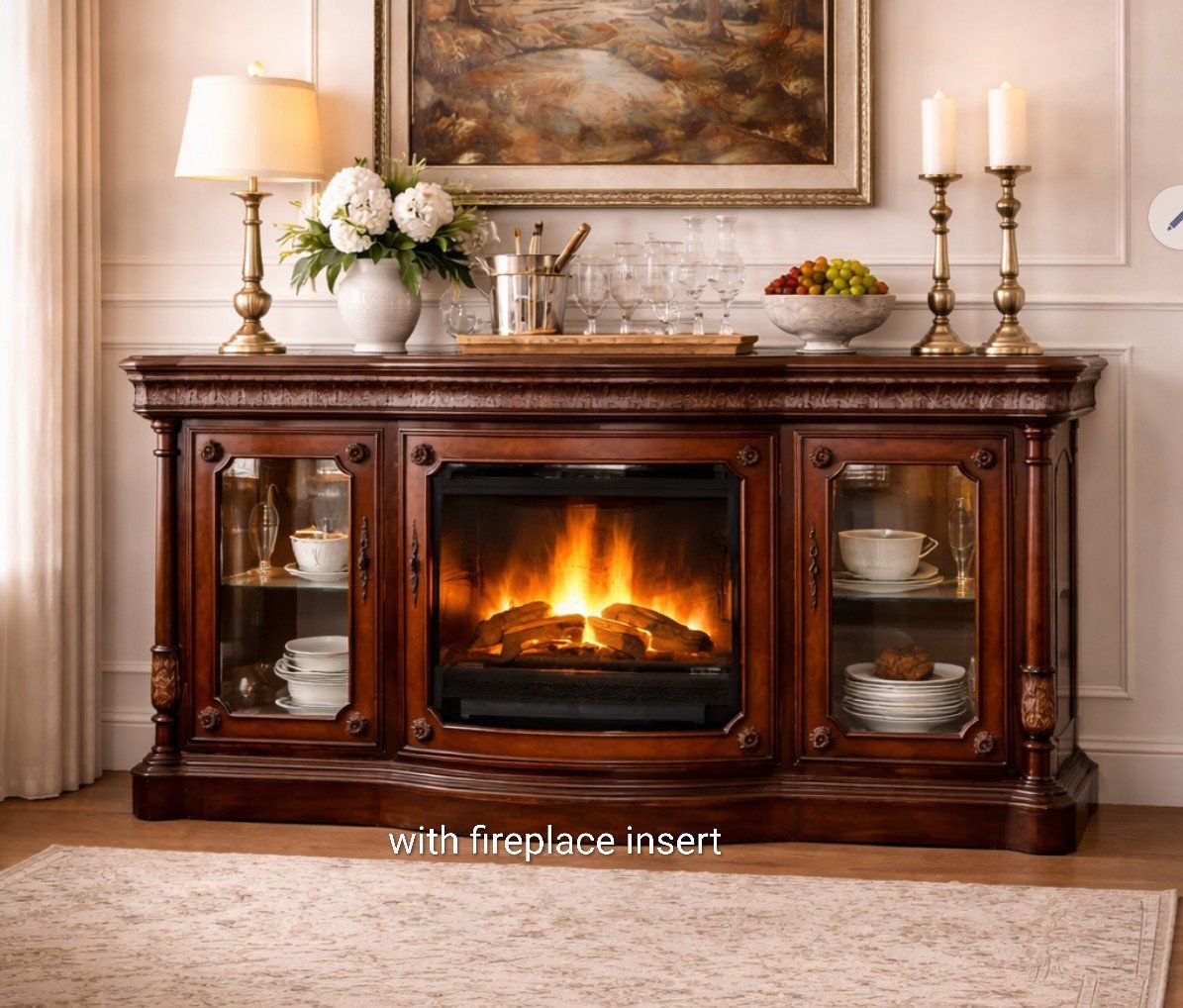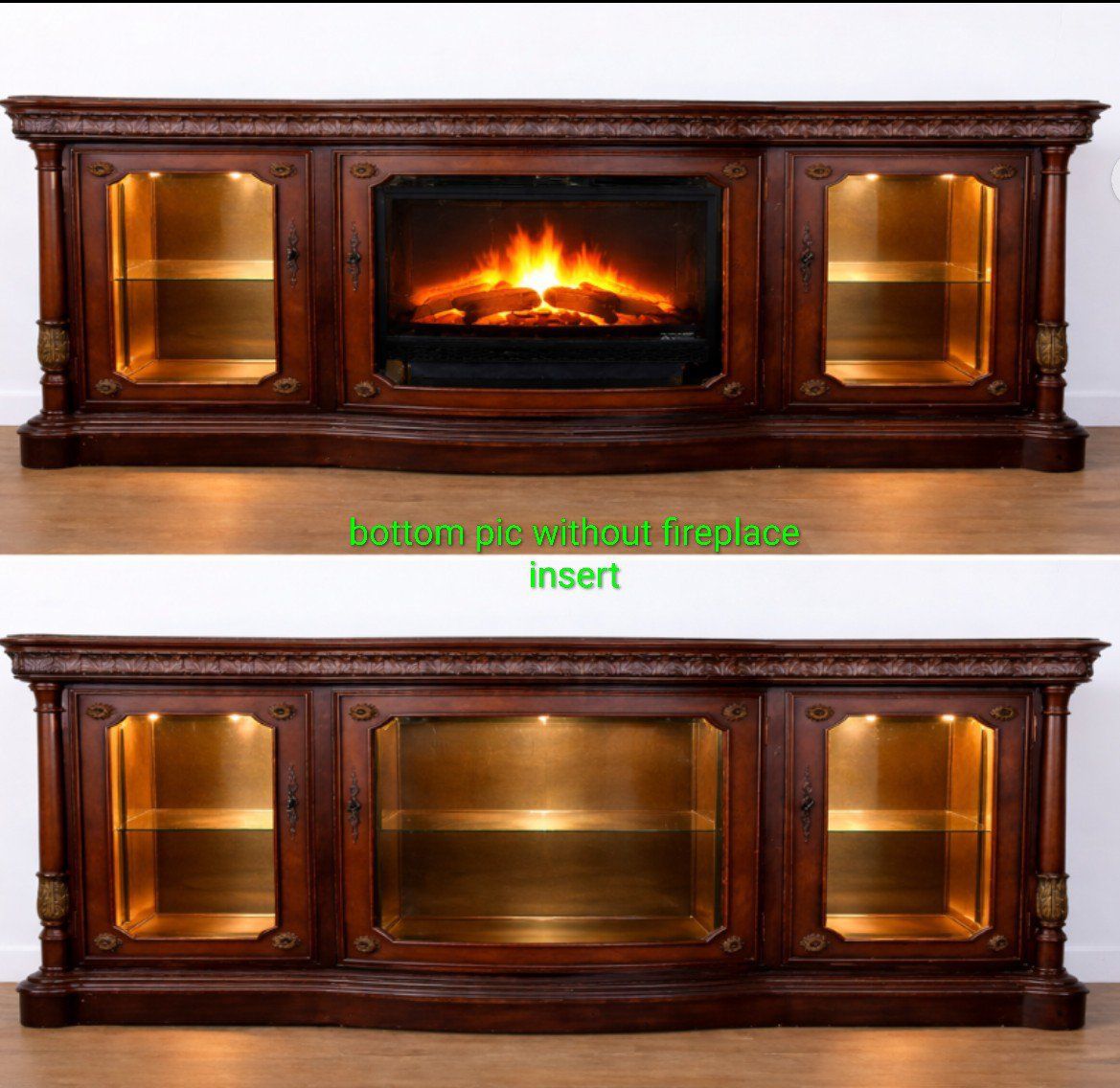 ZelleDINING ROOM BUFFET / SIDEBOARD Title: Stunning Solid Wood Buffet / Sideboard – Optional Fireplace Feature Description: Gorgeous solid wood buffet/sideboard with a rich cherry finish and timeless design. This piece works beautifully in a dining room, entryway, or even as a statement console. Features: • Spacious top for serving, décor, or entertaining setup. •Top is gorgeous too as you can see in a few of the pics with a wood inlay border as well. • Glass cabinets perfect for dishes, glassware, or display • Elegant carved details and high-end look • Solid wood construction — built to last Optional fireplace insert available – Adds a warm, ambient focal point (great for dining spaces or holidays) – Can also be removed for a clean, classic buffet look Use it as: Dining room buffet Serving station / bar setup Entryway or statement console Cozy fireplace feature piece This is a versatile, designer-style piece that can adapt to your space and style. Located in Sandy/Midvale $495 (fireplace insert optional) paid over $3000. Serious inquiries only — this is a standout piece.