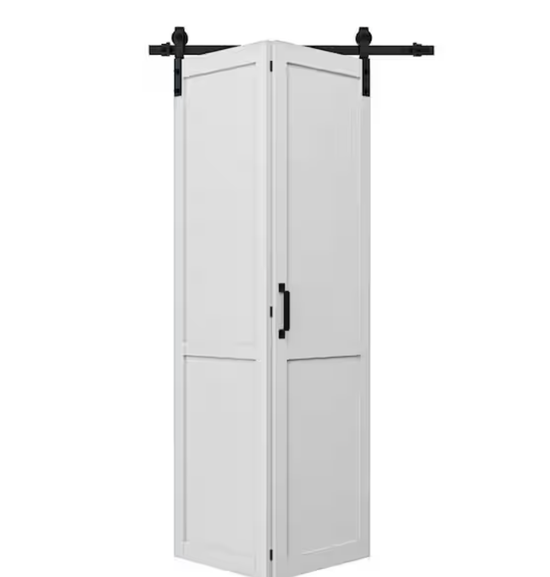 Brand new in box with hardware, 40 in. x 84 in. Solid Core White Primed MDF Wood Paneled H Design Bi-Fold Door Style Barn Door with Hardware