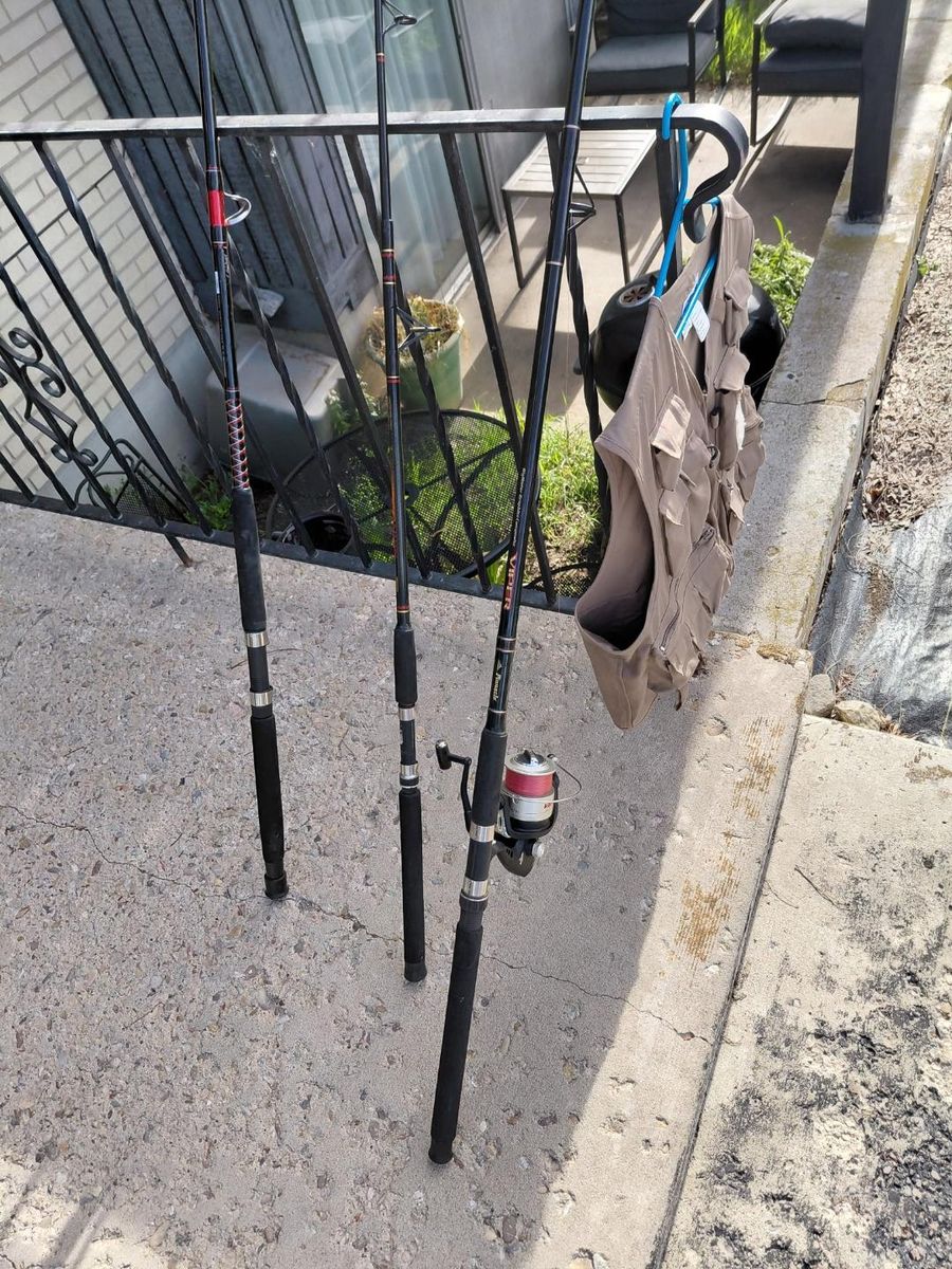 poles Like New $10 Dollars Ech. for ones in Bucket. Heavy pole and Reel $25. one $15 one 8ft.Heavy Heavy Sturgeon pole $40