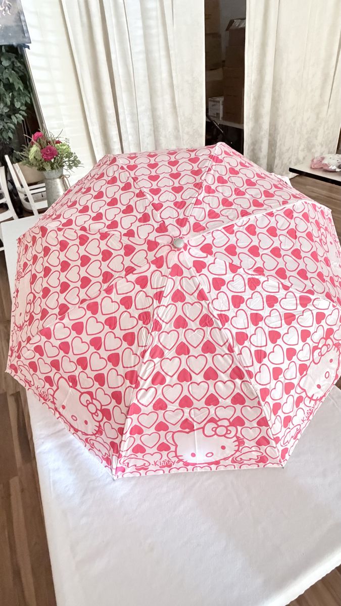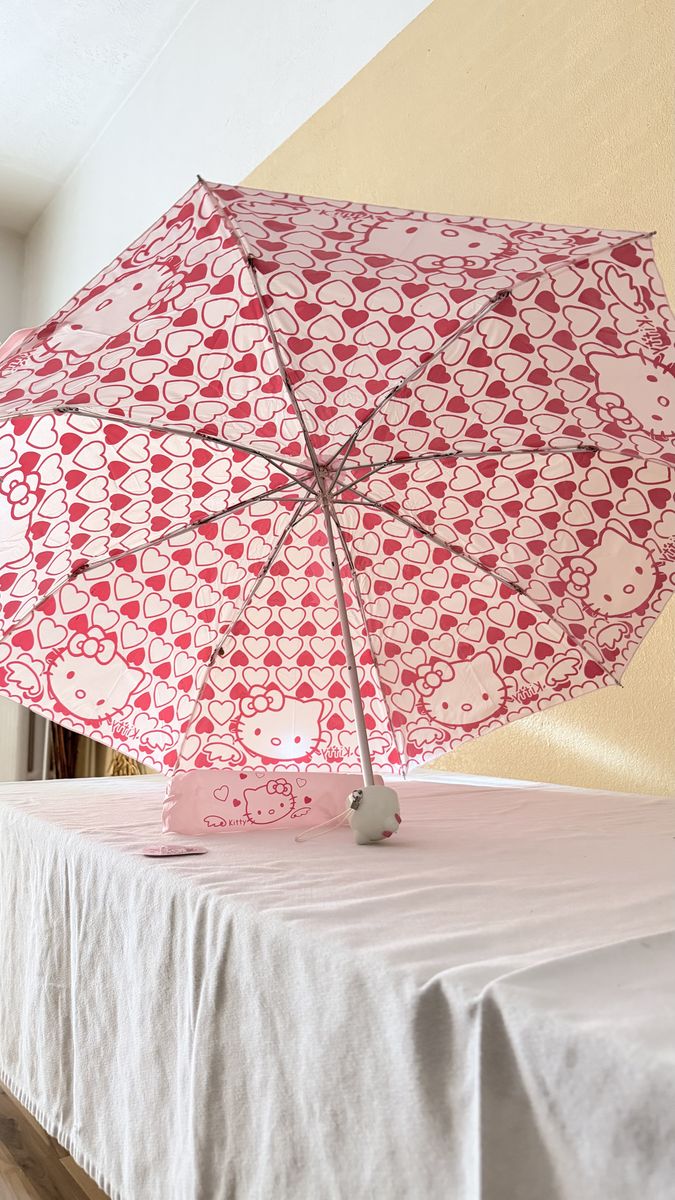 • Design: Super cute pink hearts and Hello Kitty print. • Unique Handle: Features a 3D Hello Kitty head handle. • Portable: Lightweight, folding design. Includes matching storage sleeve. • Condition: Excellent, like new. • Size: Standard travel size.