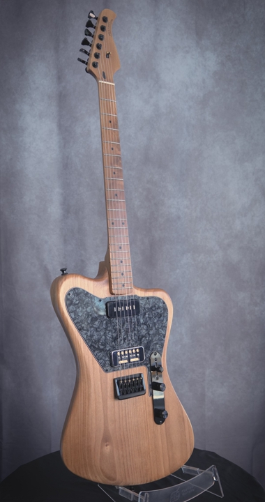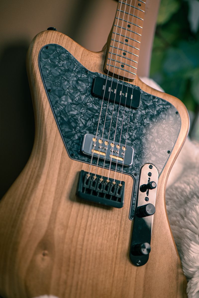 This is a One-of-a-Kind, figured Alder body & 1 piece maple neck with hemispherical Stainless steel frets. The pickups can be changed out for other options such as an identical looking Lollar Gold Foil (small upcharge) but I also loved the GFS Foil Alnico as it had more presence. The Lollar foil was more traditional chimney/foil sound. The Eric Custom® P90 Alnico V Bar Pole Neck PU has thick, warm bite - similar to a P-90, but I think you will even like this better.