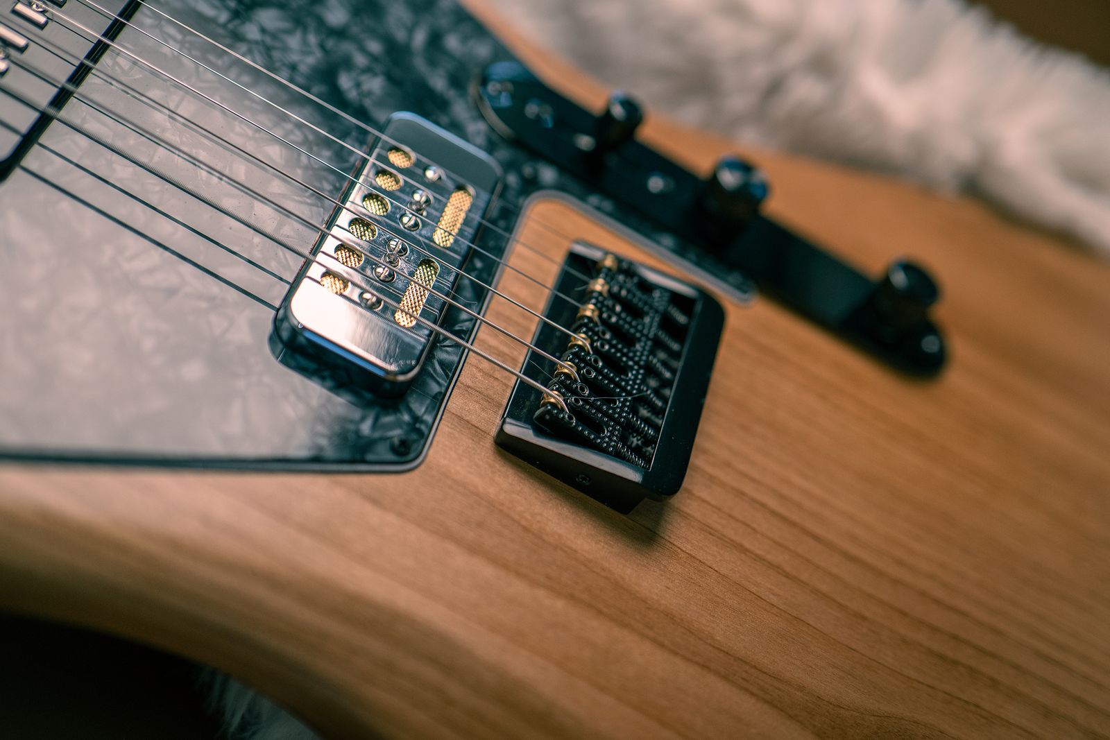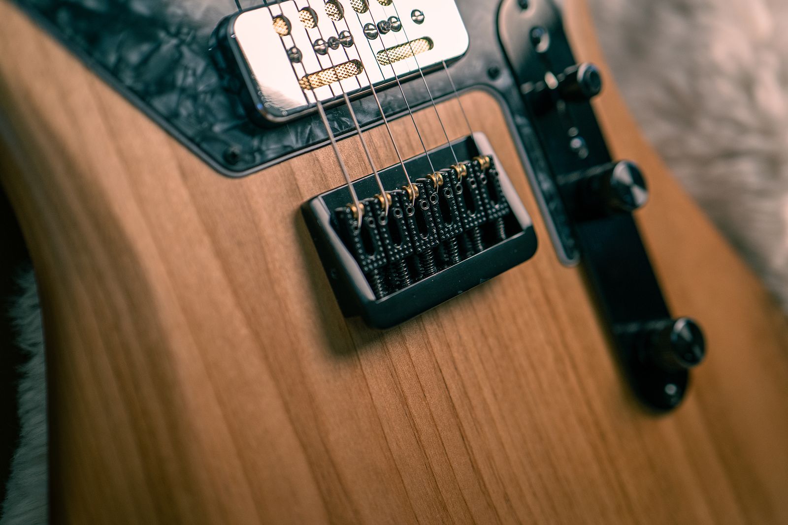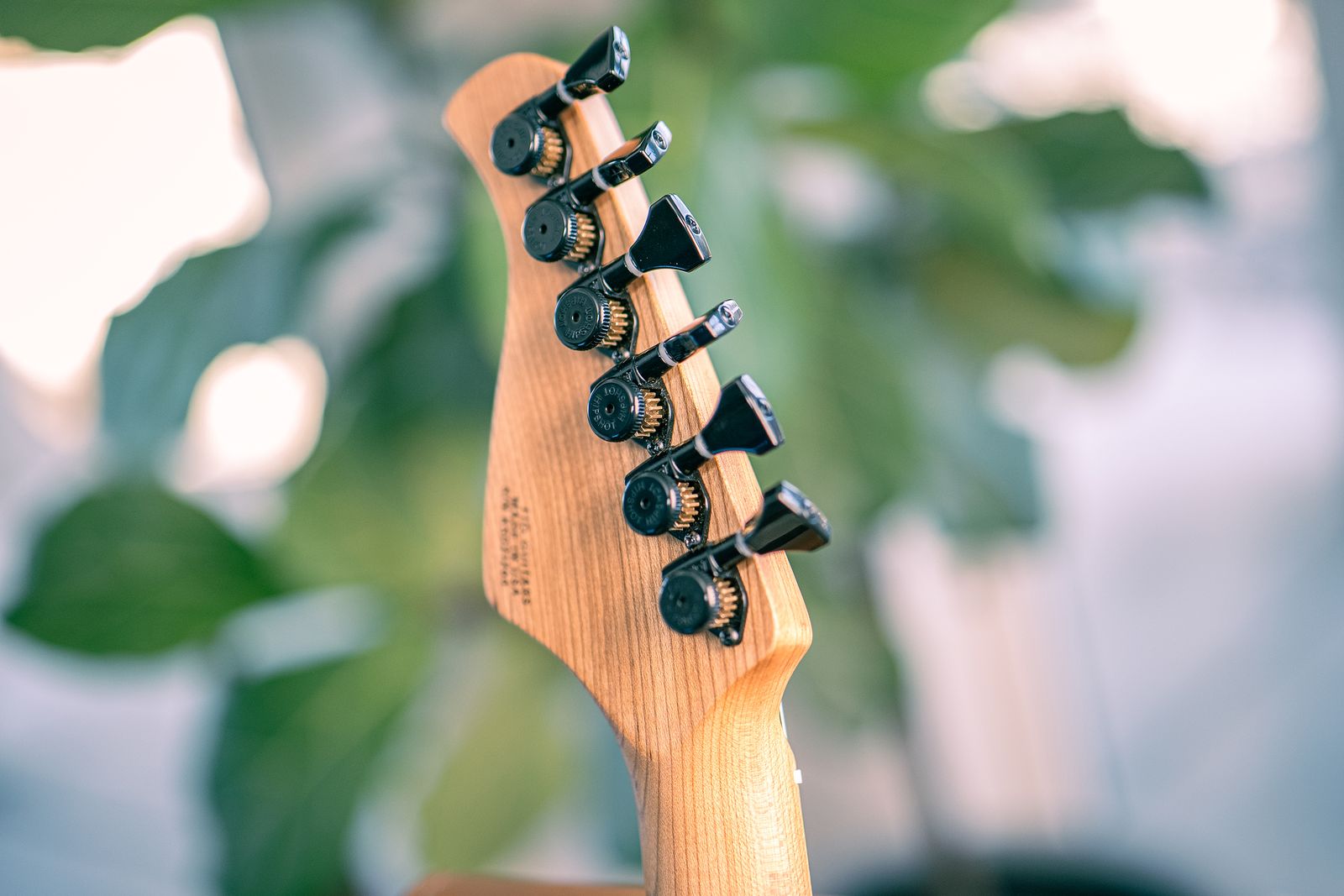 HARDWARE • HipShot Staggered Locking Open Tuners • Wilkinson Compensated 6 Copper Roller Bridge • Black Aluminum Selector, Volume & Tone Knobs • Black Aluminum Control Plate • Custom Black Pearl Pickguard • Solid Brass Ferrules • Brass Roller String Tree • Dunlop Straplok® Dual Design Strap Buttons
