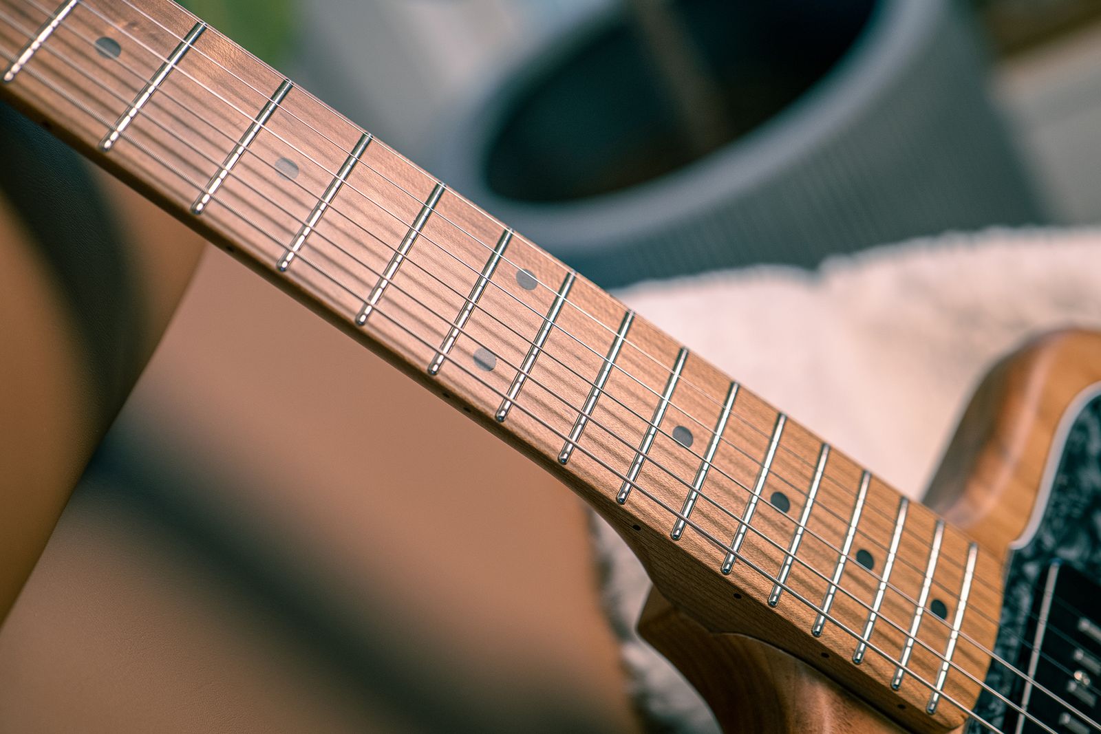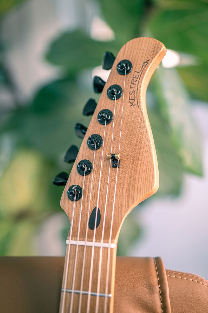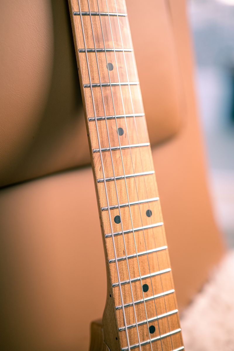 NECK • Satin 1 pc Roasted maple • 21 Stainless Steel Rounded Fret ends • Medium C Neck contour • Dual Action Truss Rod • Walnut Skunk stripe • Rolled Fretboard Edge • Bone Nut