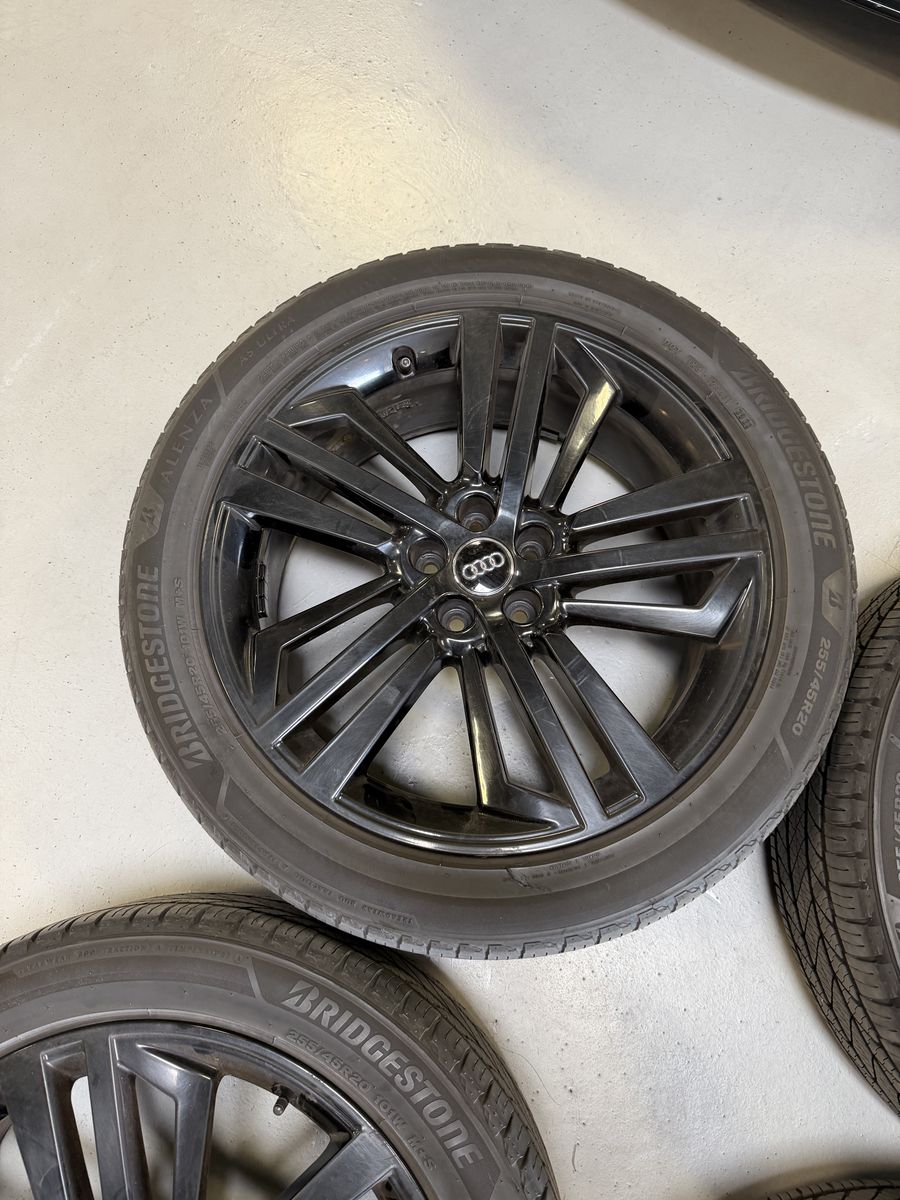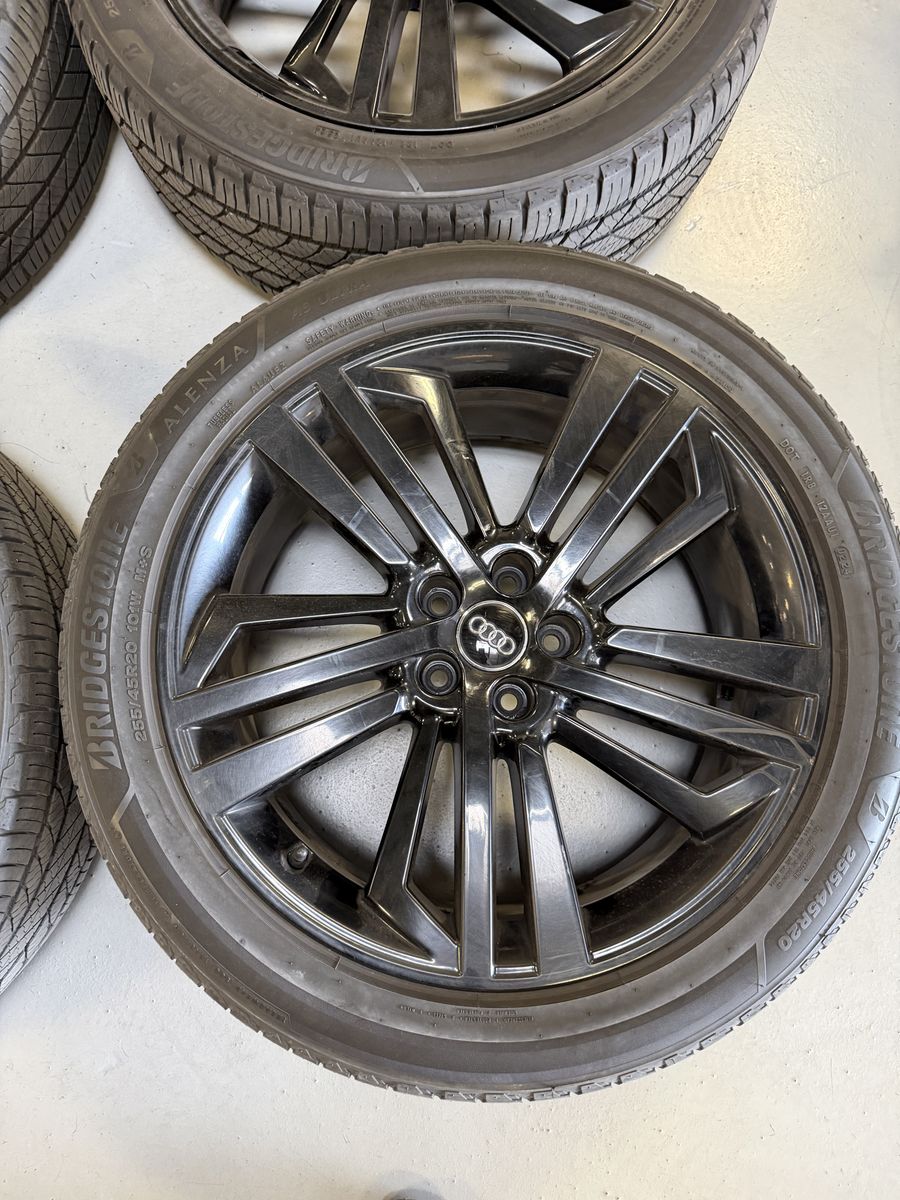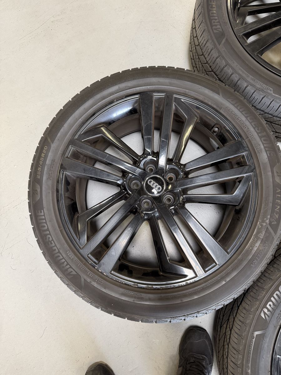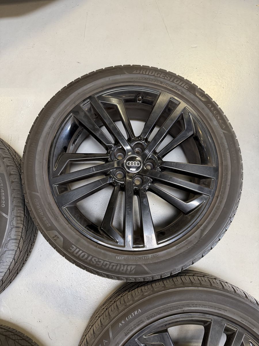 Tires have a little tread left but not much. 3-4 32nds of tread. Wheels are in decent shape, some gloss black touch up and they’d be fine to run. Oem Audi q5 20 inch wheels that we powdercoated a long time ago and came back on a trade in. Just balanced so you can bolt them and go or swap your tires on.