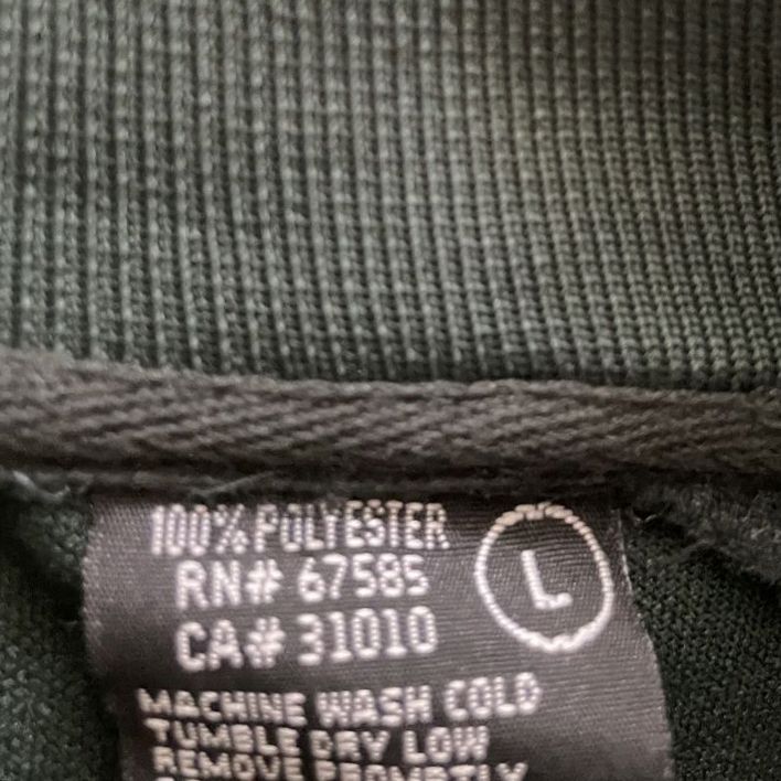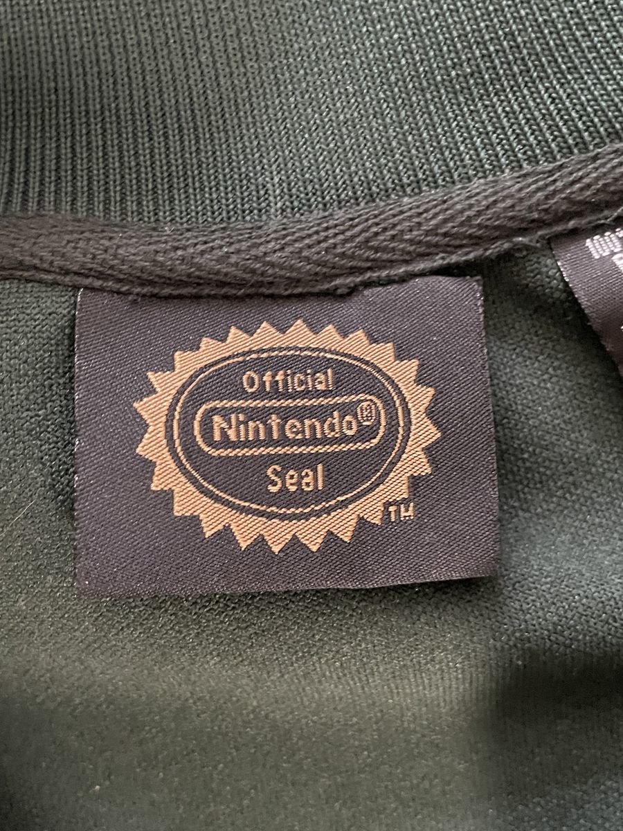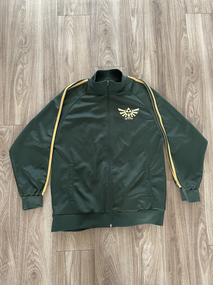 The product is an authentic vintage Nintendo Legend of Zelda full-zip track jacket in green and gold, size LARGE. In very good condition. Normal wear with no blemishes.
