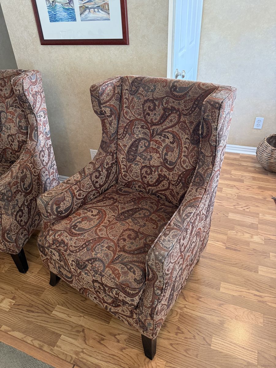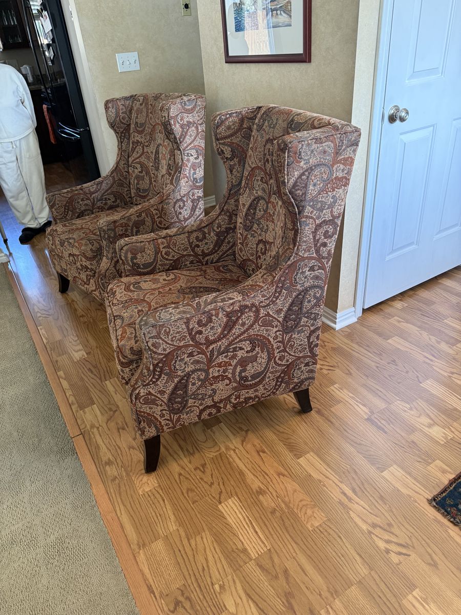 VenmoI originally purchased these chairs from pier 1 for $250 apiece. They are brown in color with a paisley print. Very comfortable. Sturdy. Always been kept in a smoke and pet free home. Can accept cash or Venmo. Located in Sandy. Let me know if interested.