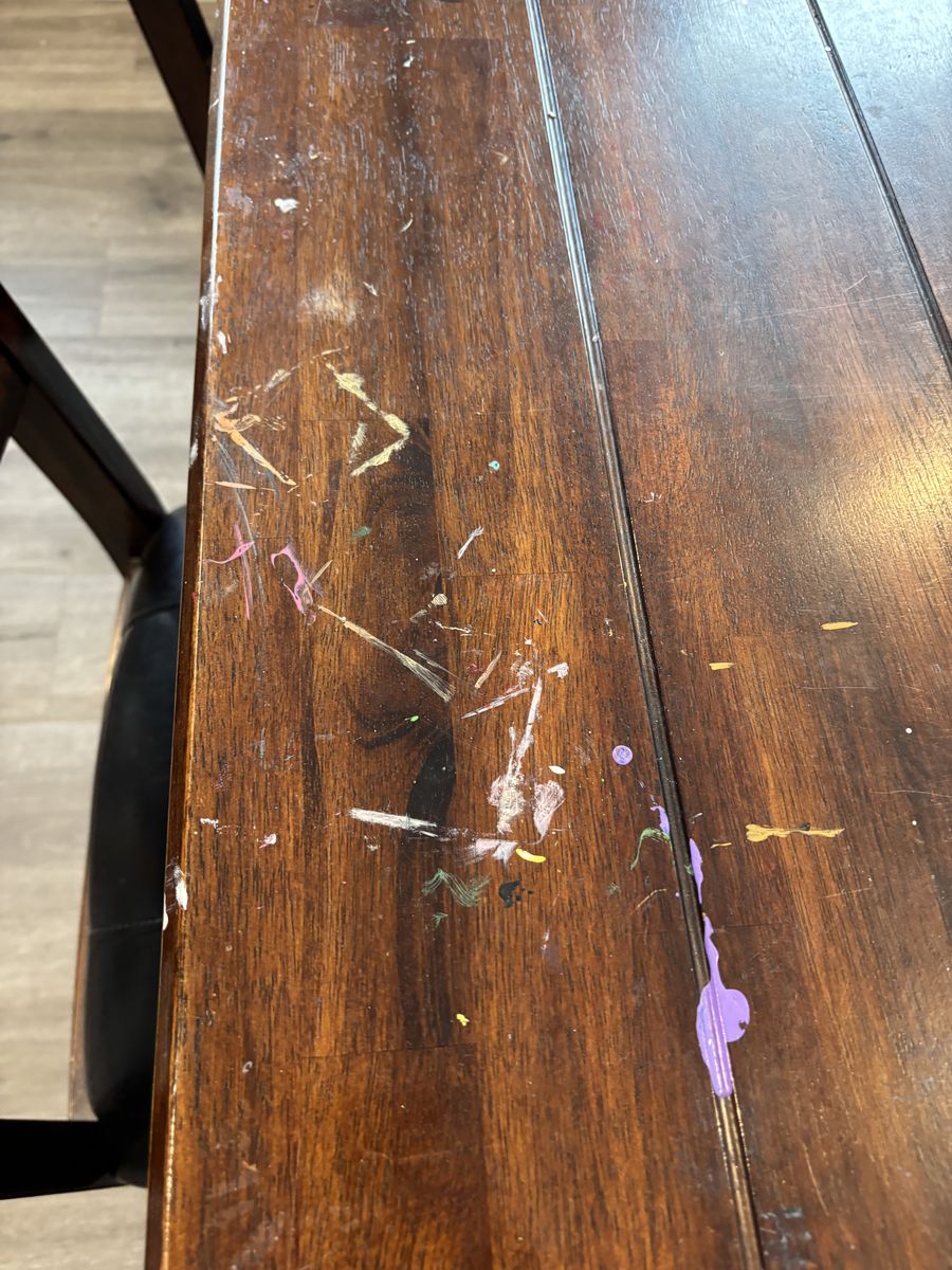 It was used as an art table for my kids for years and it is covered in paint. The table itself is in good shape and great for those who strip these down.