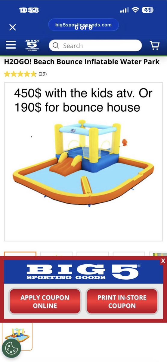 VenmoAtv is 24v has a brand new battery that we bought for it. Steering is a hit && miss on turning but that’s it. Bought it brand new for 500. Asking 300$. Or make a deal with the water bounce play set. Buy both of them for 450$. Or separate as the bounce house is 190$. Bought that brand new at 250.