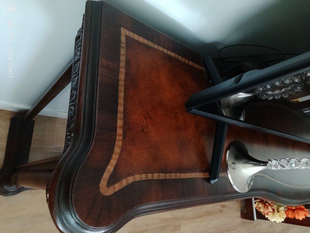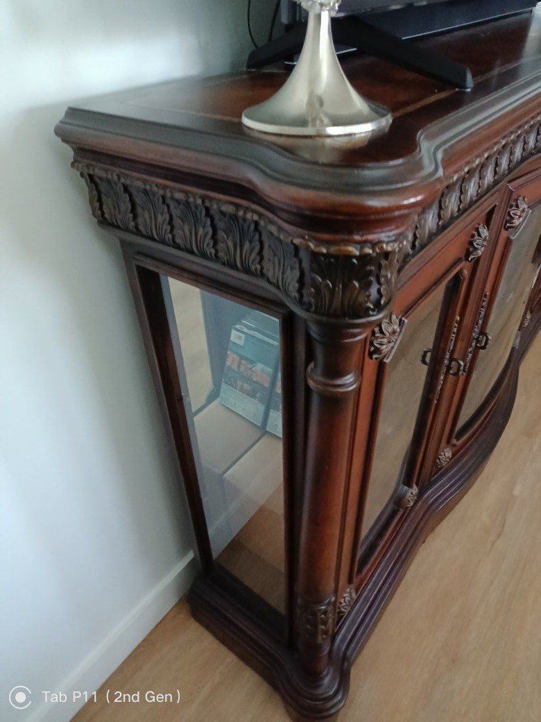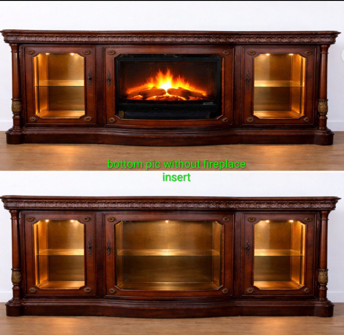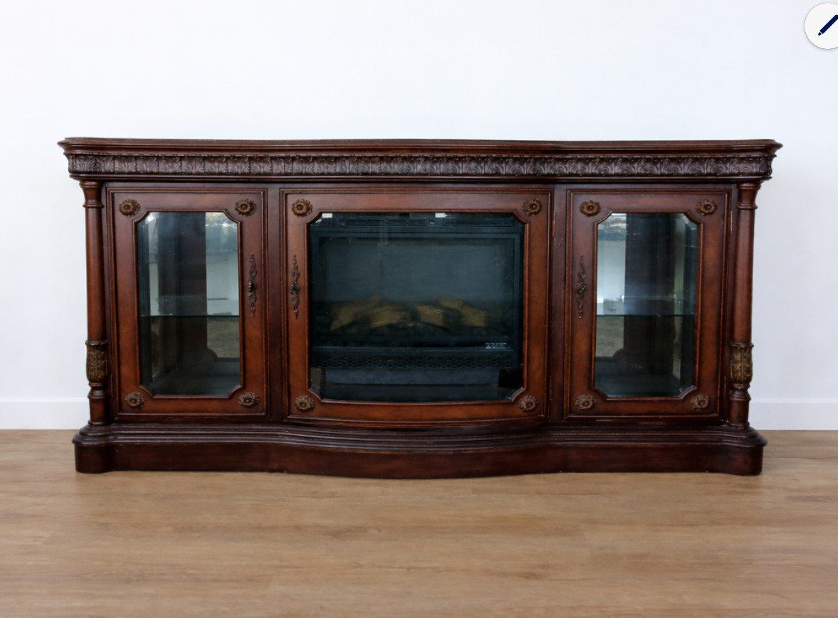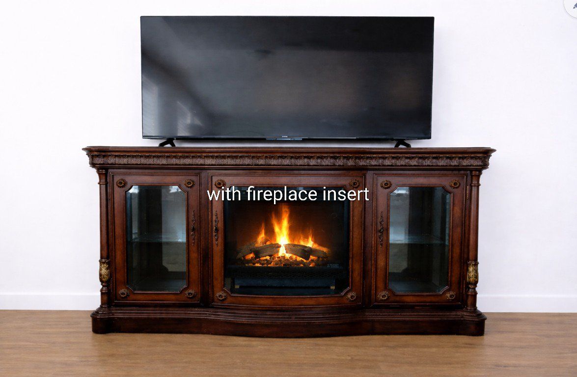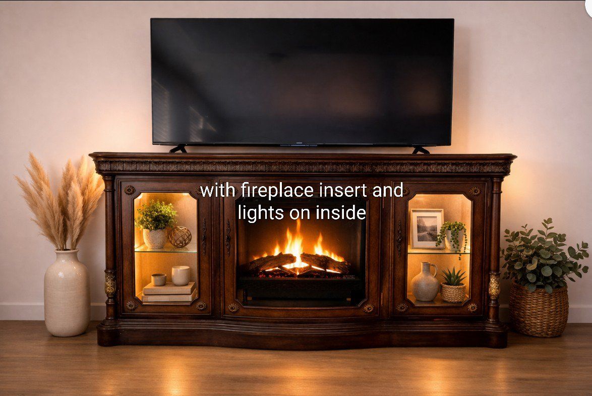 ZelleElegant Solid Wood TV Stand / Fireplace Console – Optional Insert Description: Beautiful solid wood entertainment console with rich cherry finish and detailed craftsmanship. This is a high-quality, statement piece — not particle board — and instantly elevates any living room. The top features gorgeous multi-tone wood grain patterns with a decorative border inlay, giving it a custom, furniture-quality look you don’t see in newer pieces. Features: • Large surface fits big-screen TVs • Glass side cabinets for display or storage • Interior shelving for media, décor, or electronics • Interior lighting in all lower cabinets (adds a warm, high-end glow) • Solid, sturdy construction with classic design Optional electric fireplace insert available – Can be included for a cozy, high-end look – Or removed if you prefer a clean cabinet/storage setup This gives you the flexibility to use it: As a traditional TV stand As a fireplace console As a display/storage piece Condition is excellent and very well cared for. Perfect for anyone wanting a warm, upscale look without paying retail prices. Located in Sandy/Midvale area Priced at $495 (fireplace optional) paid over $3000.00 Message me with questions or to come see it!