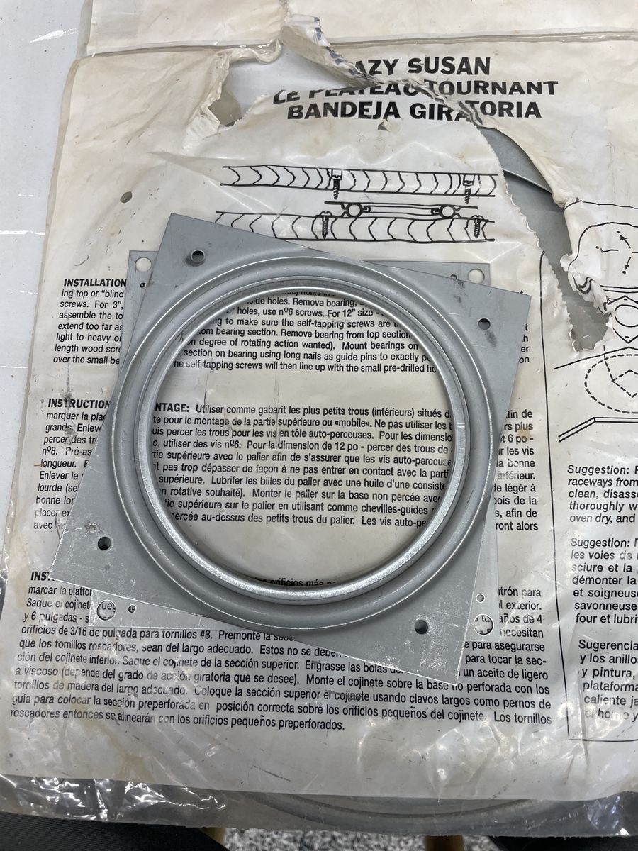 I have 3 lazy Susan bearings all new never installed 2 are 12” and 1 is 6” asking $3 for the large ones and $1 for the small