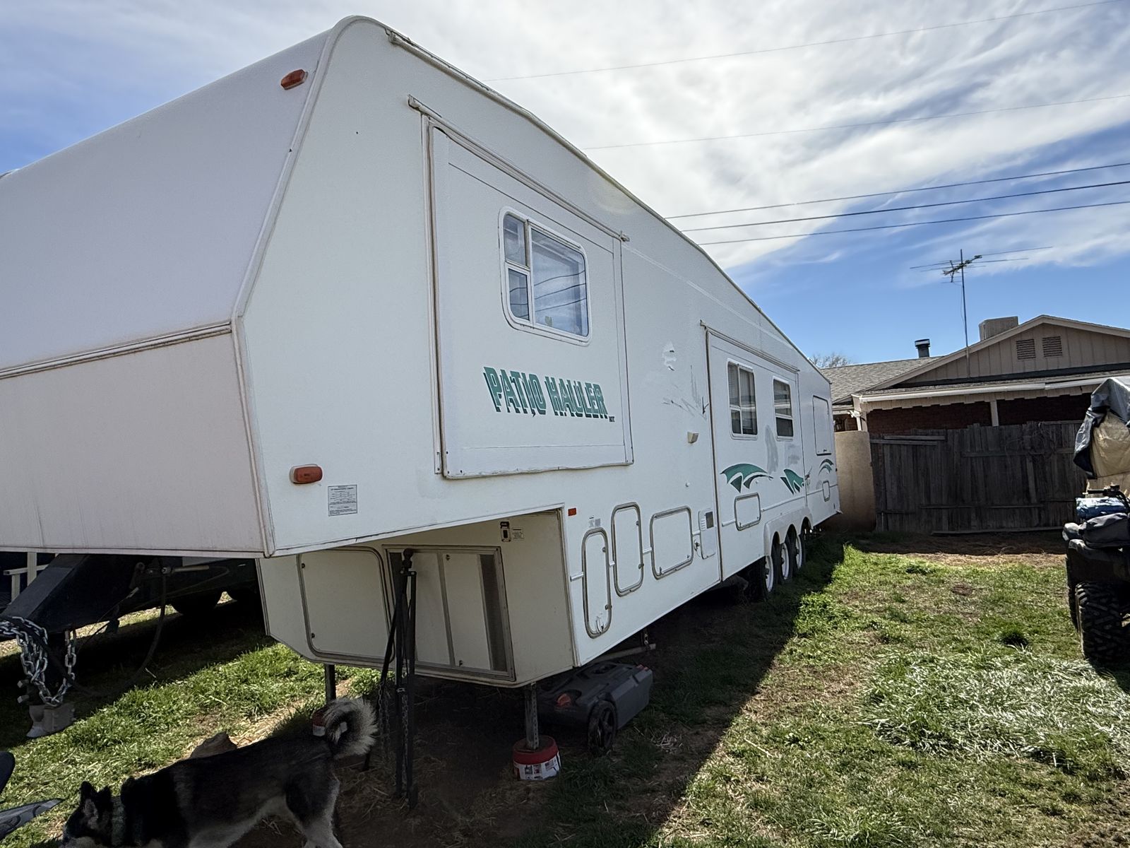 1999 Patio Hauler 40ft Fifth Wheel. The garage fits a smaller rzr or two four wheelers. Everything works good. Comes with generator built in. The garage is 9 feet long, the garage door is 6 feet tall. 5,000 obo. Will take offers on price.