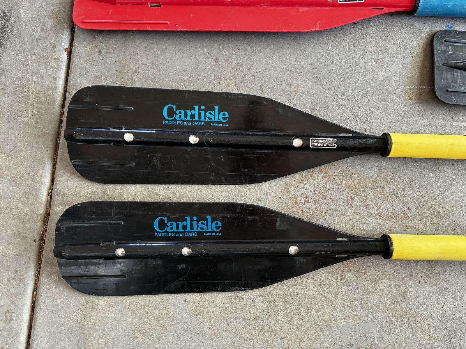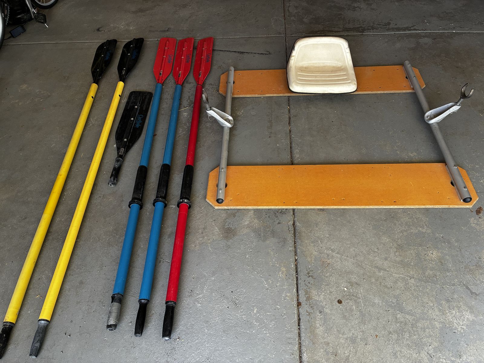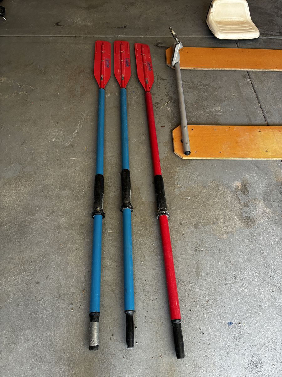 PayPalRaft frame in very good condition, with laminated plywood benches and tractor seat. Width is 46", and rails are 48" NRS stock (come with rubber end caps). Includes oarlocks and towers. Also included are three 8' Carlisle oars/blades (5.5" wide) and two 8'3" Carlisle oars/blades (7.5" wide). Three additional black blades are available. The red blades have some hairline cracks, and one of the yellow shaft sheaths has some cracks (see pictures). If you don't need the whole package, make me an offer on what you do need. Thanks for looking. OBO