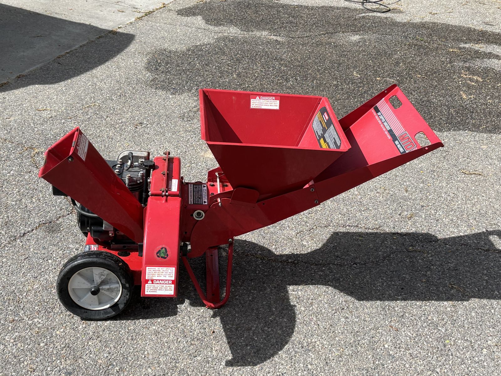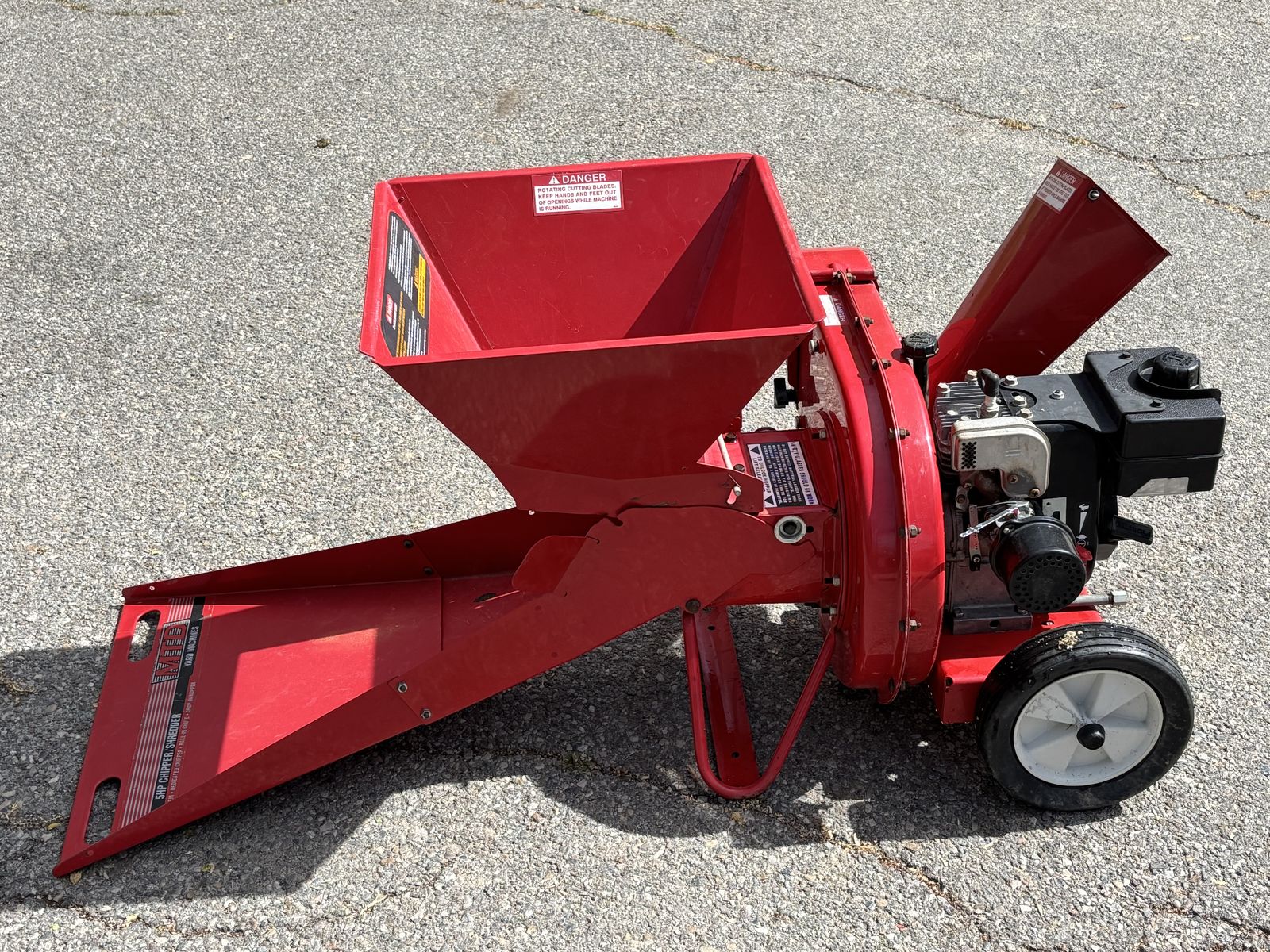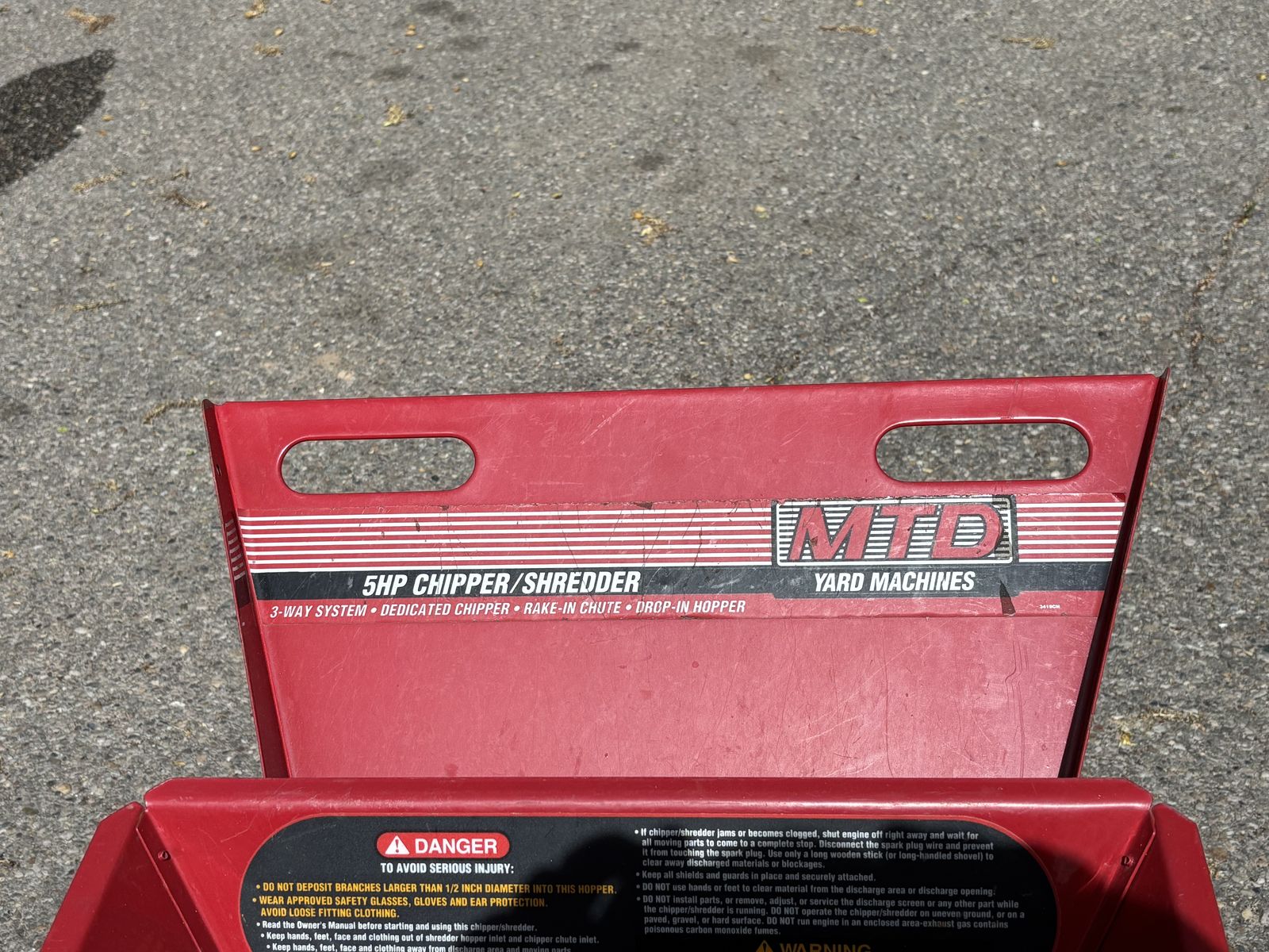 MTD wood chipper with 5hp motor. it has a small chute, large chute, and rake in ramp.