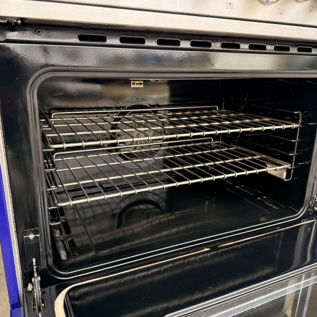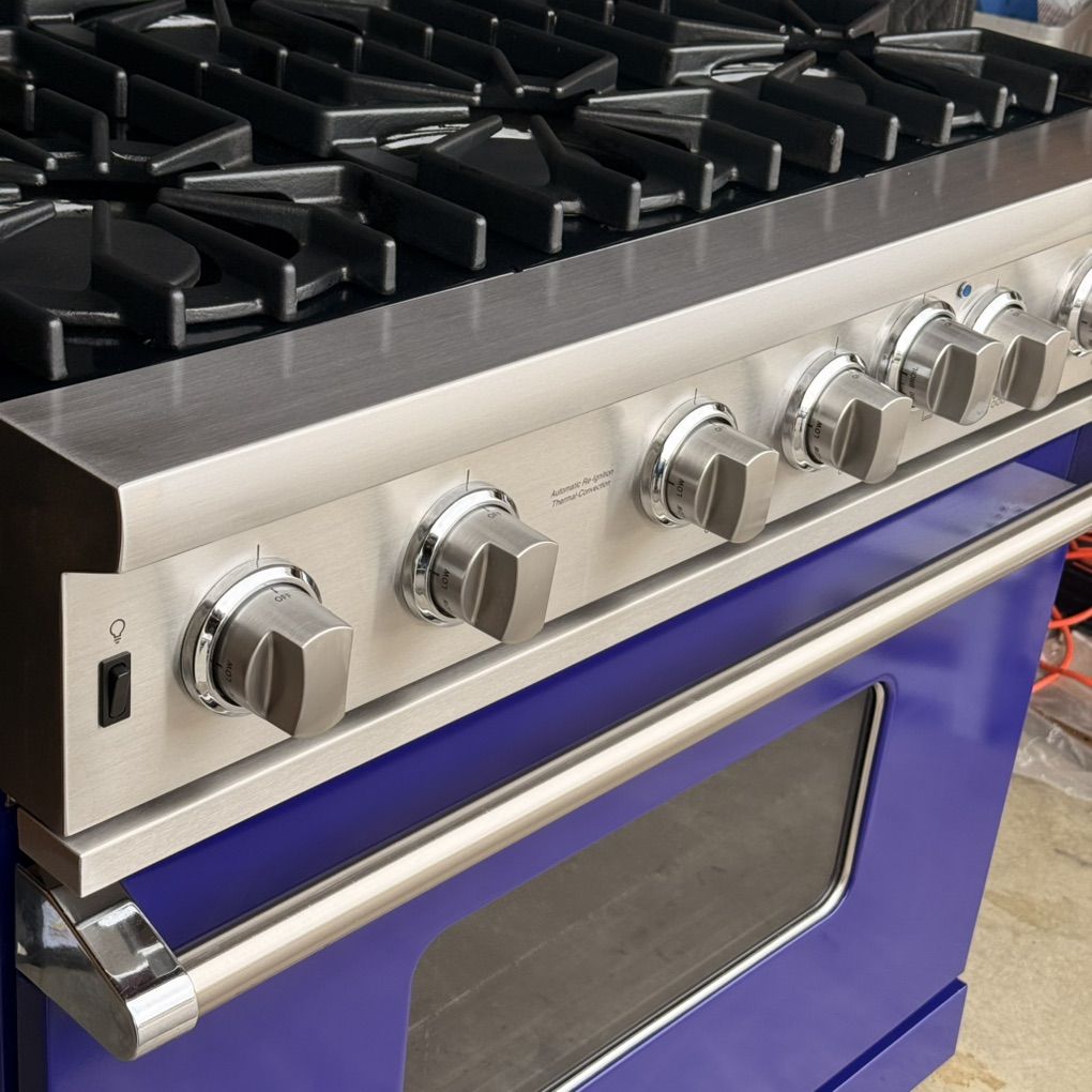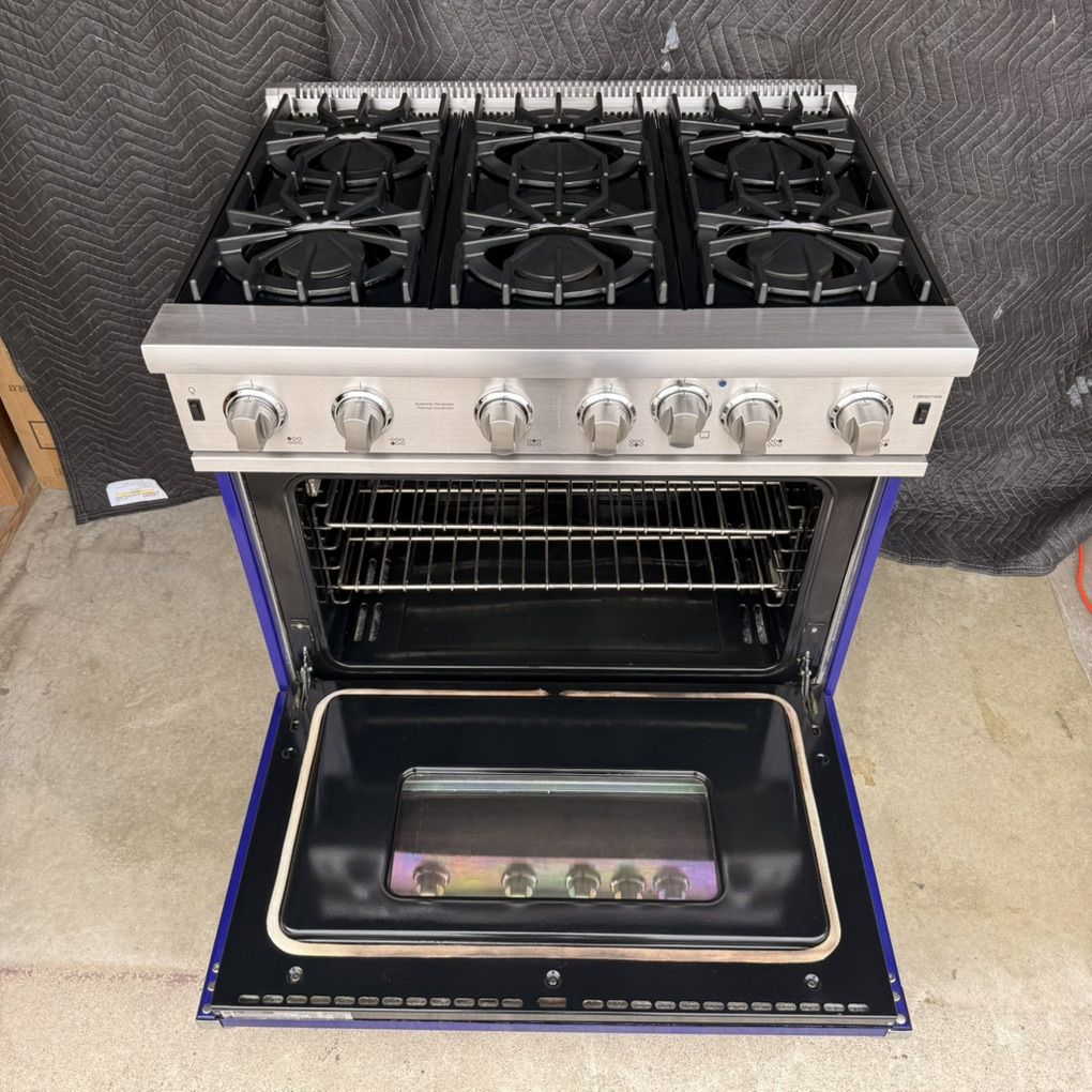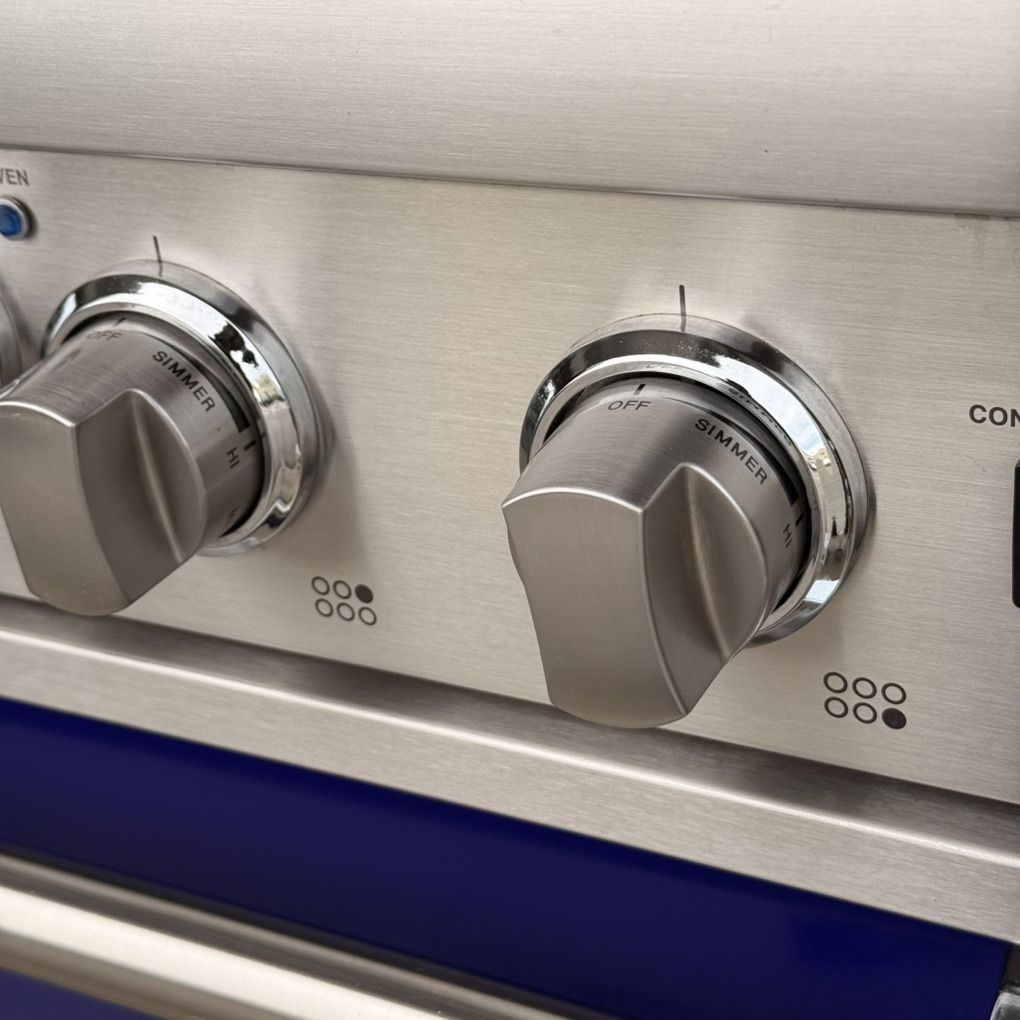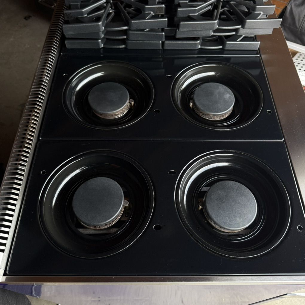 Condition: This is a previously used item in very good condition. The stainless steel has light surface scratches typical of normal use. The grates show light wear. There are a couple of small chips in the blue paint of the kick plate. It has been tested and functions perfectly. It has been fully cleaned.