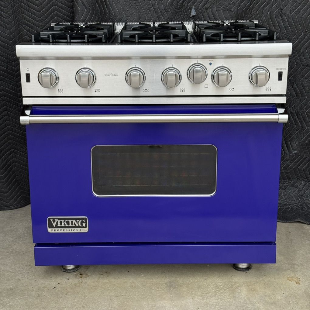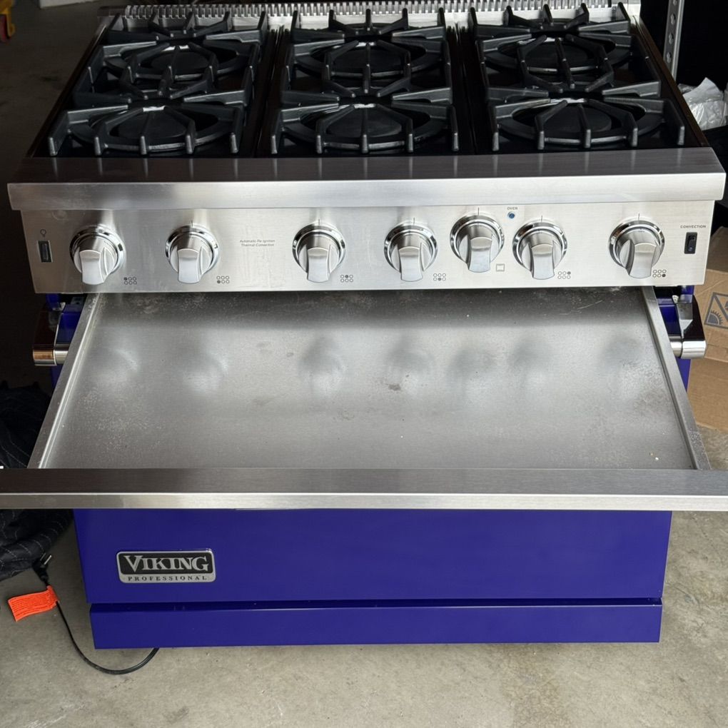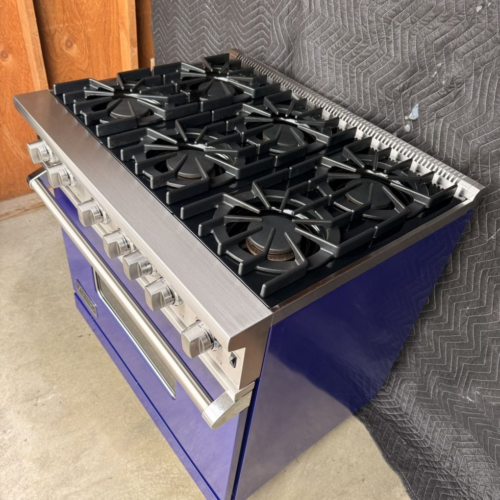 Used Viking Professional 36 Inch Gas Range, 6 burners 15000 BTU each, 30000 BTU Convection Oven, Broiler. Set for Natural Gas , 120 v. Model: VGIC53616BCB02, S/N: 042117C10257323