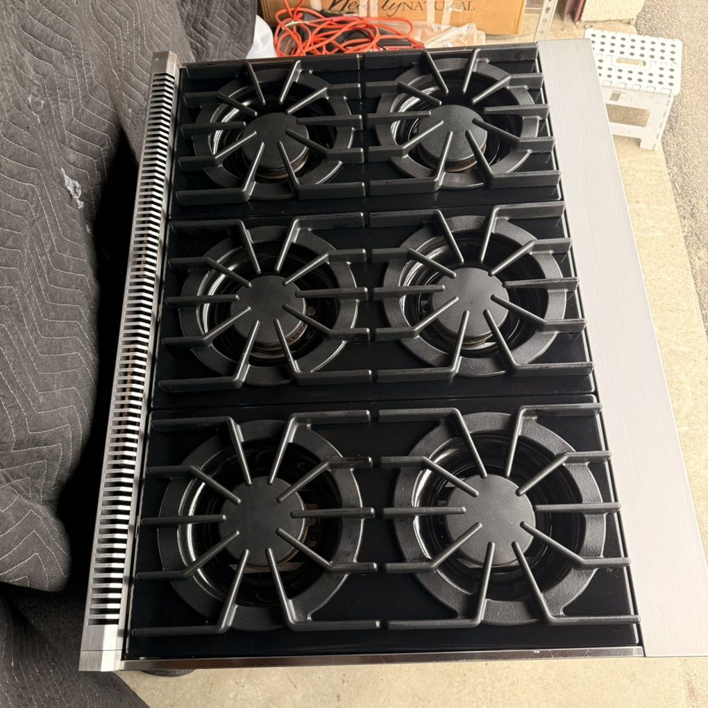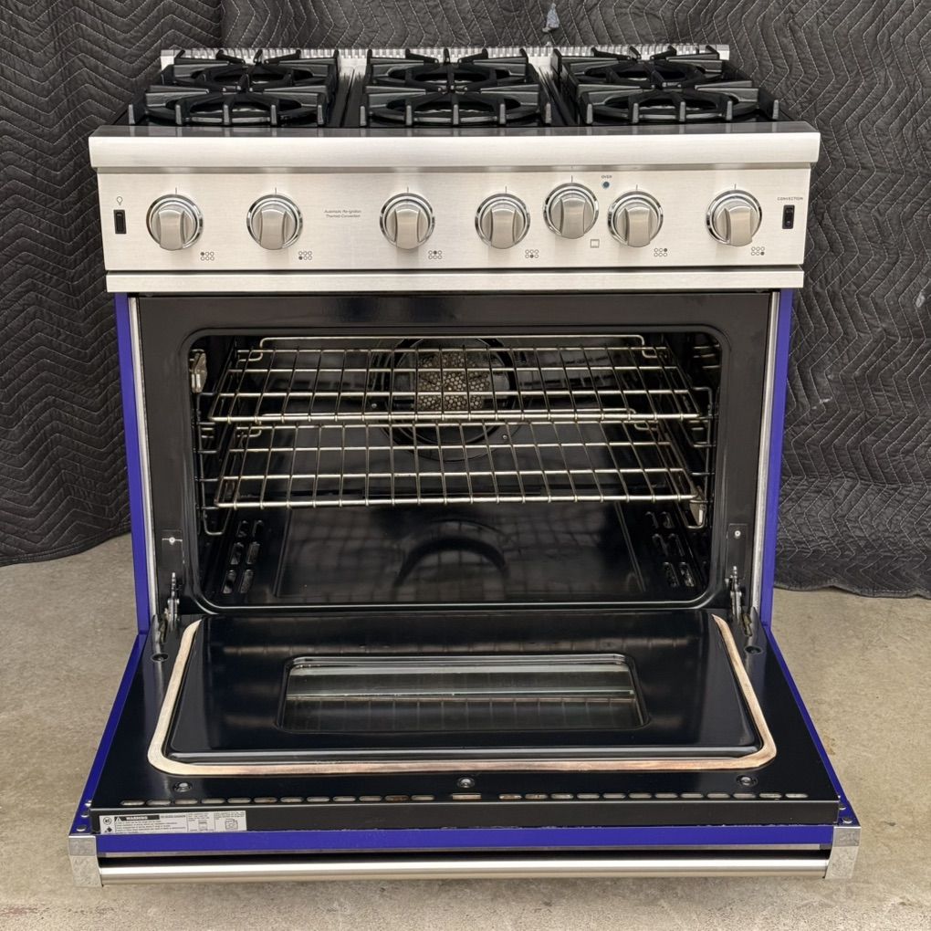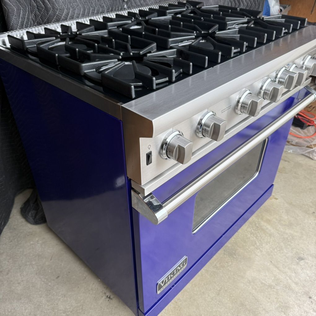 Used Viking Professional 36 Inch Gas Range, 6 burners 15000 BTU each, 30000 BTU Convection Oven, Broiler. Set for Natural Gas , 120 v. Model: VGIC53616BCB02, S/N: 042117C10257323