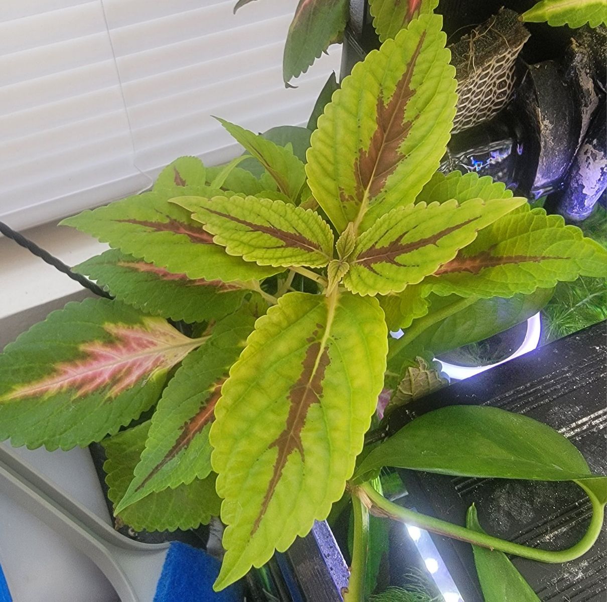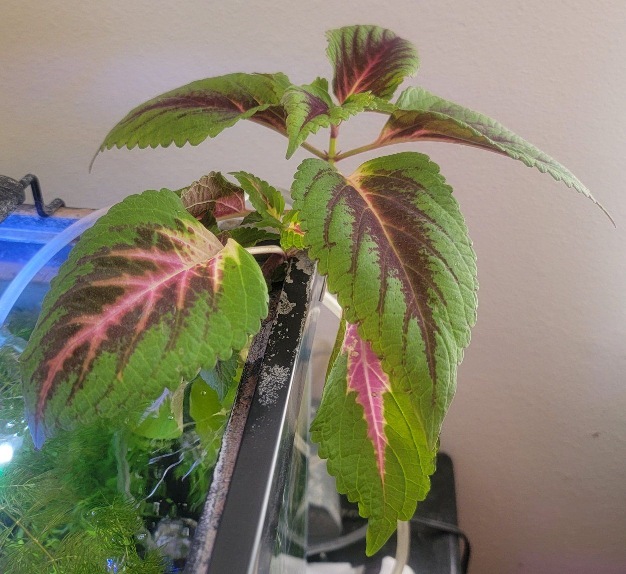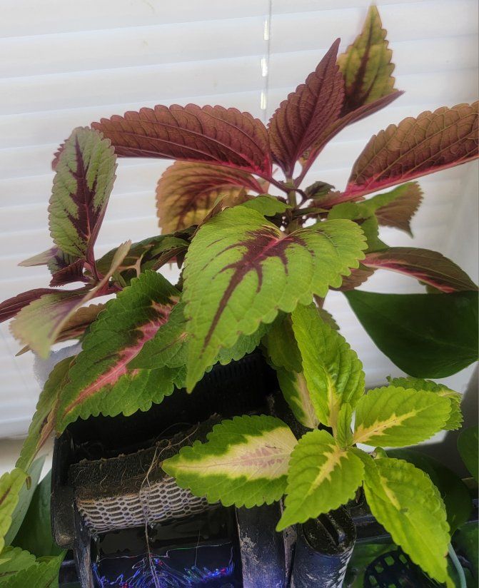 I've rooted these coleus starts in fish tank water. They have beautiful pink and purple veins. They will grow easily in a vase of water or you can plant them in soil inside or outside.