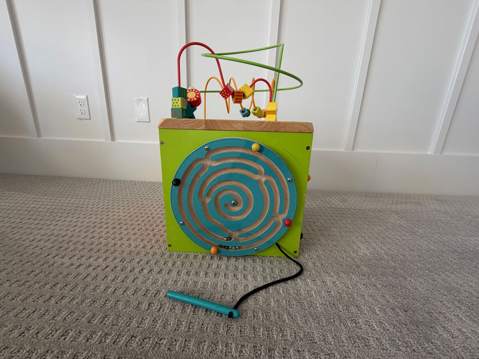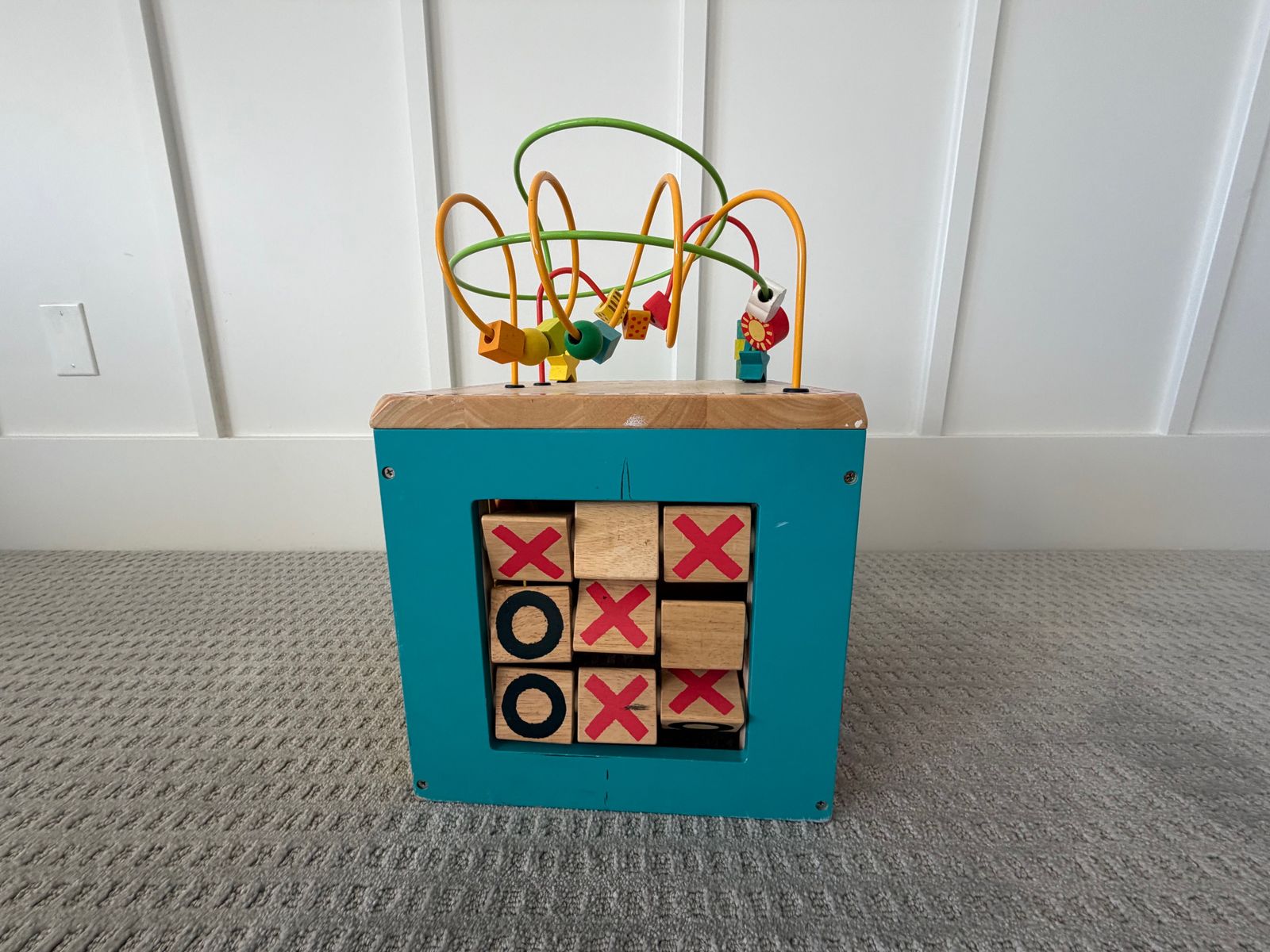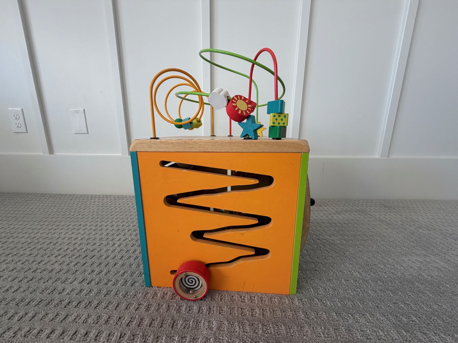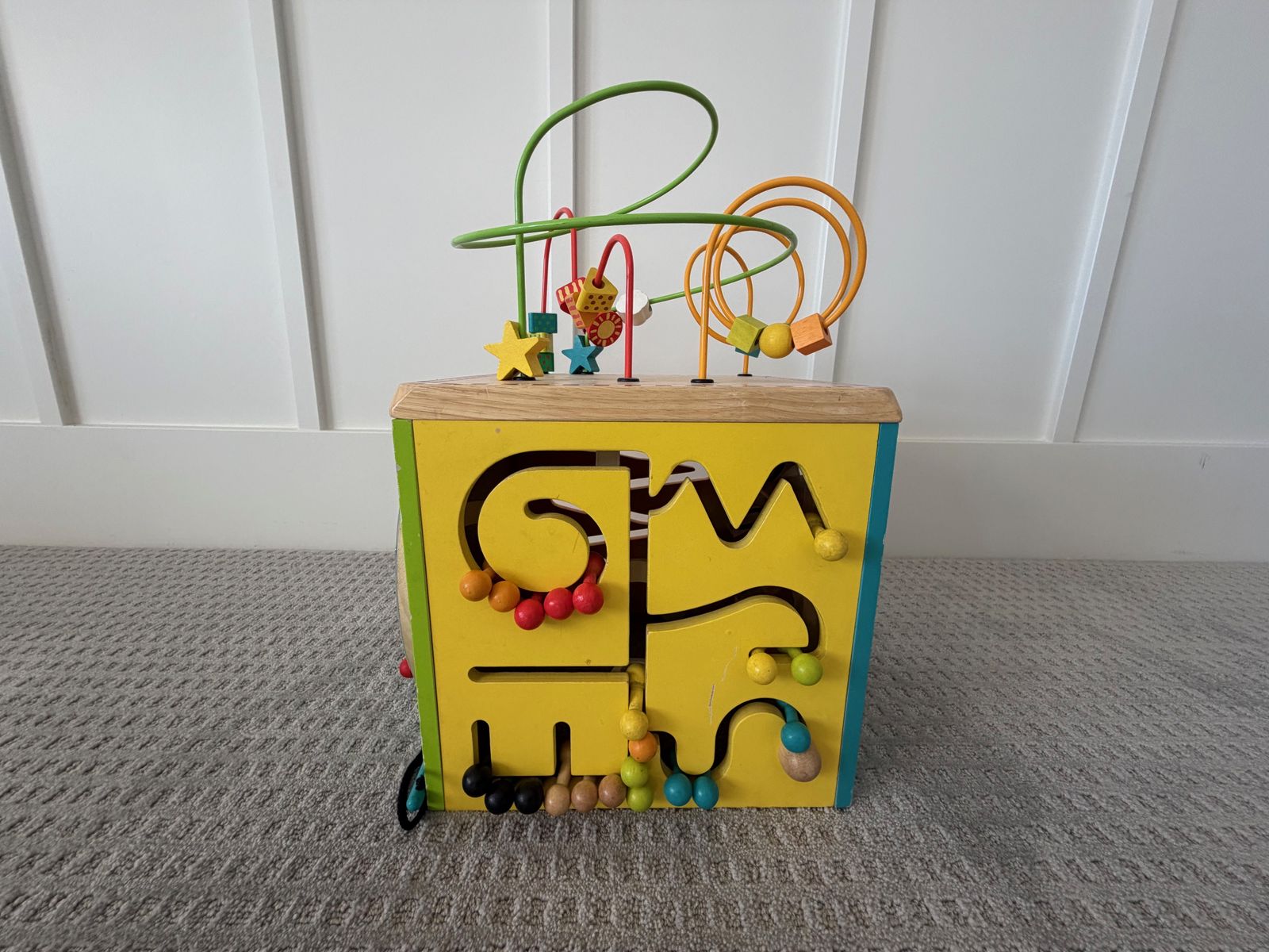 VenmoMulti-sided Wooden Activity Cube Includes bead maze, spinning gear, tic tac toe, ... - Approx. 12" on each side.