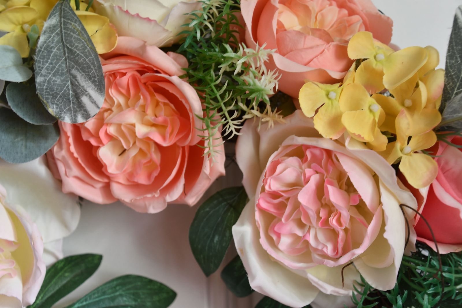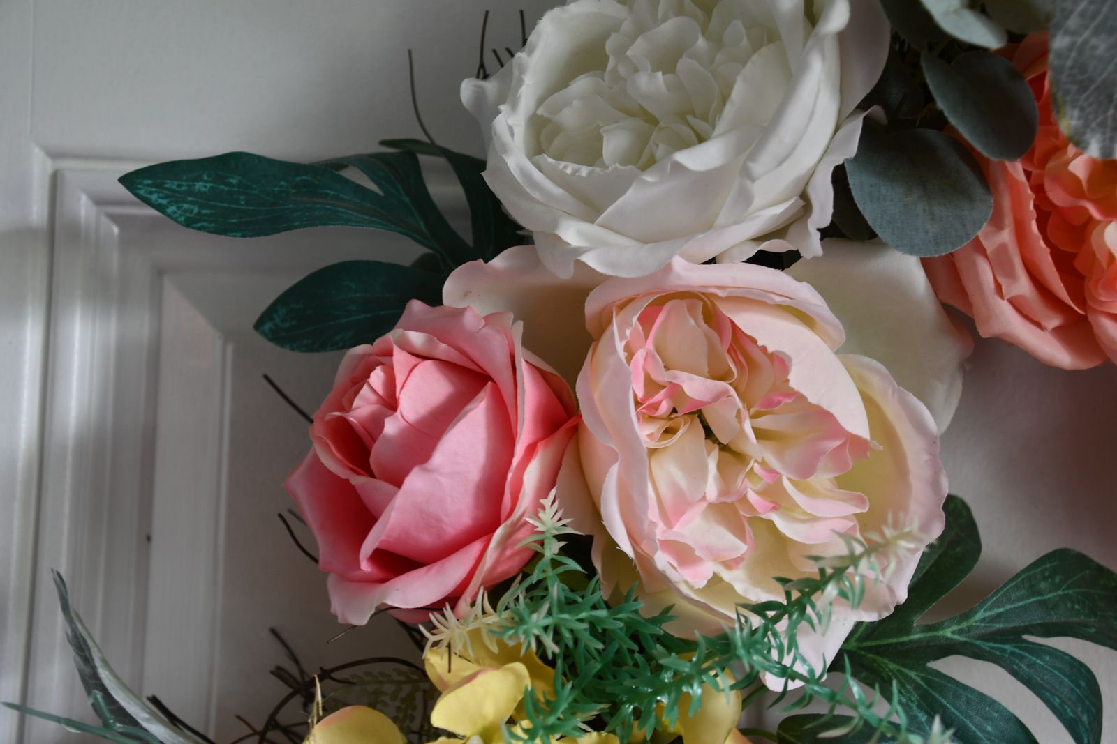 This SPRING & SUMMER WREATH is about 18". It has shades of pink, white and yellow. Our home is smoke free. Questions??? Please ask. We are located in Plain City. Cash only please.