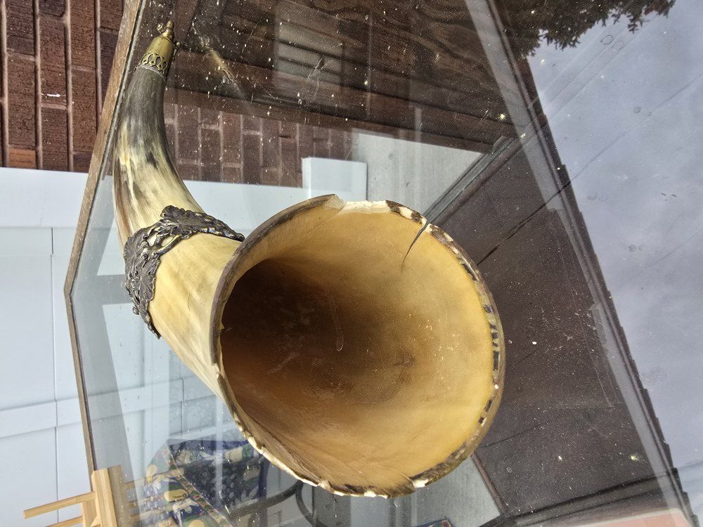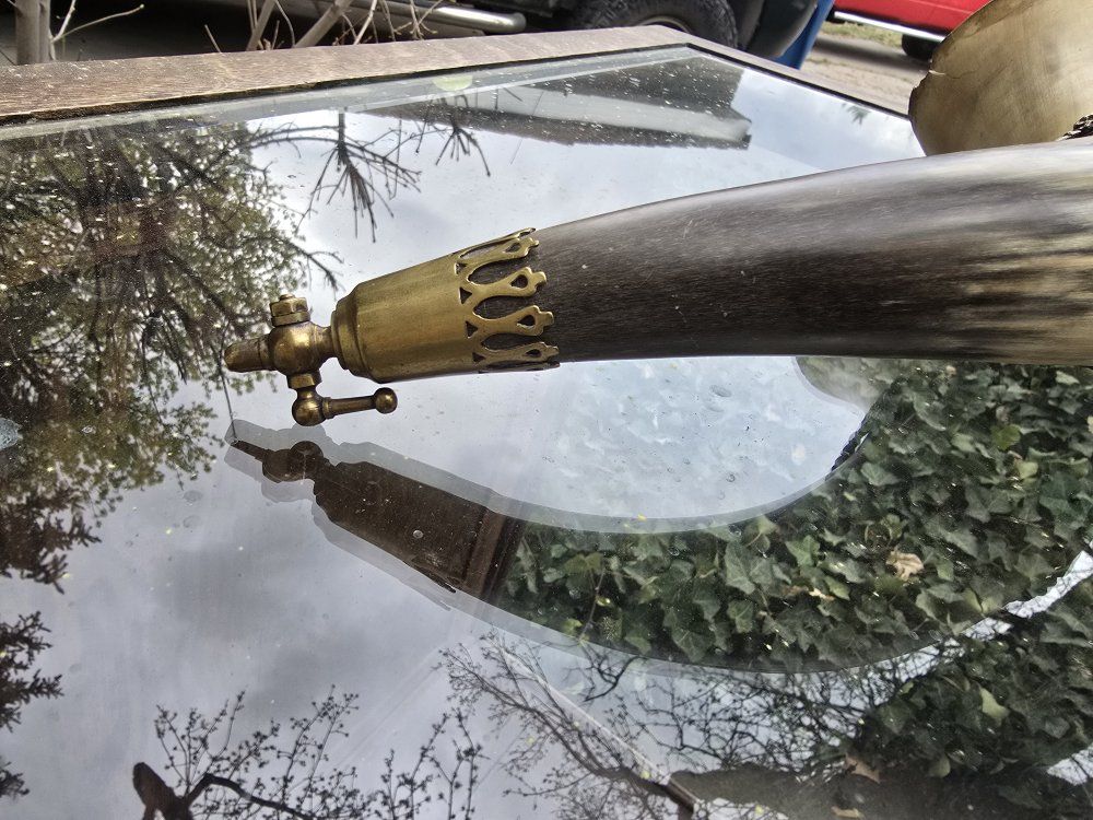 drinking horn with ornate brass and valve. some cracking at base of horn. call steve 801-830-2855